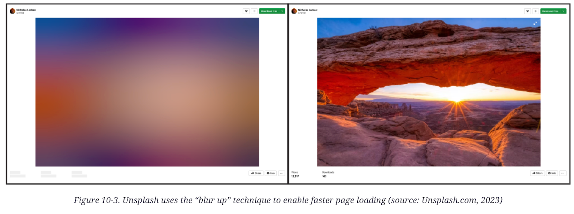 影象模糊載入 Blur-up Technique:先載入低解析度的模糊版本,再逐漸替換為高畫質版本。提供即時視覺反饋,減少頁面載入等待的突兀感。常用於大型圖片展示網站或新聞媒體首頁。
