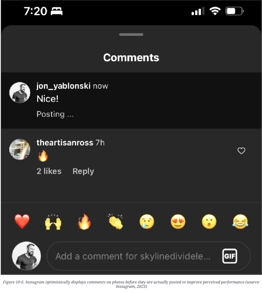 即時反饋 :Instagram 釋出評論時立即顯示“已釋出”狀態,即使後臺還在處理資料:給使用者帶來操作完成的即時感。背景處理繼續執行,最終完成提交。改善了應用響應速度的感知體驗。