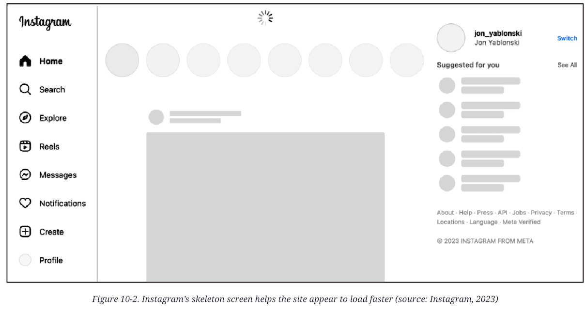 骨架屏 Skeleton Screens(Instagram):當後臺資料載入需要的時間超過 400 毫秒時,可以使用骨架屏佔位:先顯示頁面結構的灰色框架,待資料載入後替換為真實內容。提高使用者對速度的感知,減少等待的焦慮。避免內容突然跳動(content jumping)影響閱讀體驗。