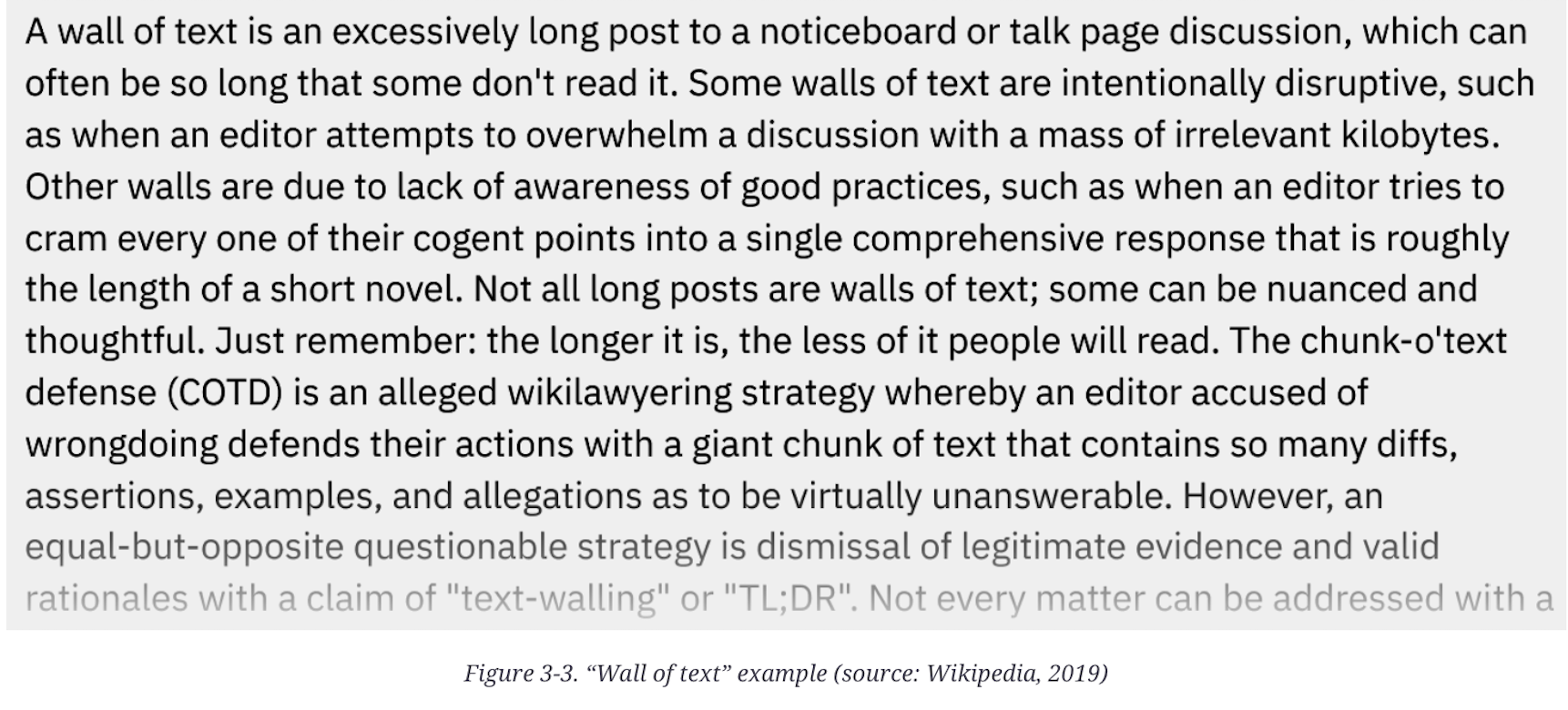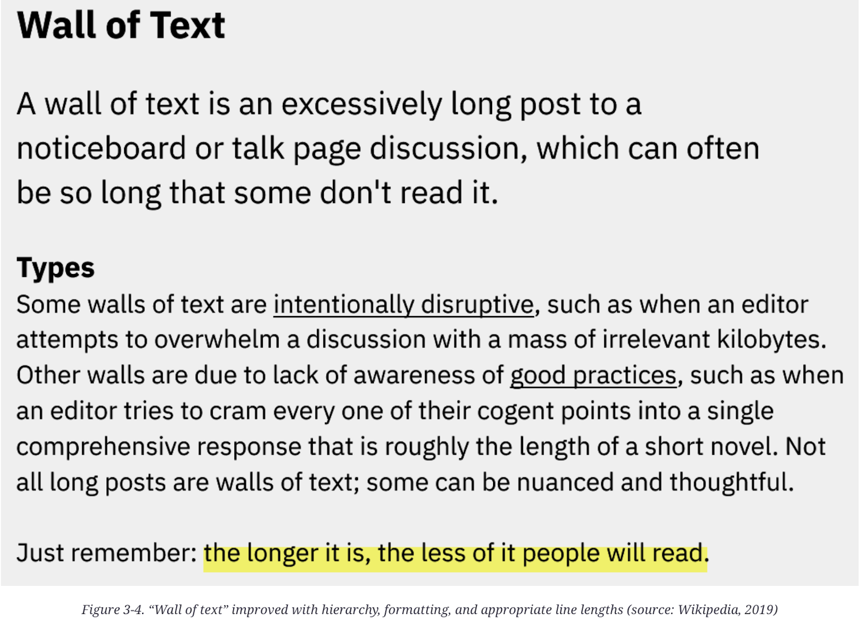 未分段的大段文字讀起來十分費勁,會顯著增加使用者的認知負荷。將內容格式化、分層並調整到適當行長後,閱讀體驗與原始文字相比立即改善。透過新增標題和副標題建立層級結構,利用空白將內容分成易識別的部分,縮短行長提升可讀性,為文字連結加下劃線,並高亮關鍵詞使其與周圍文字形成對比。