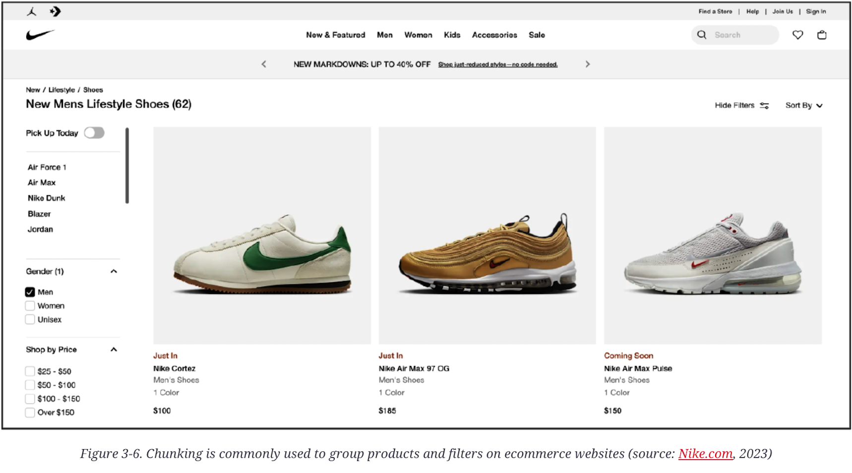電商網站Nike透過分塊對產品資訊分組,還利用分塊將相關篩選條件分組放在左側邊欄。