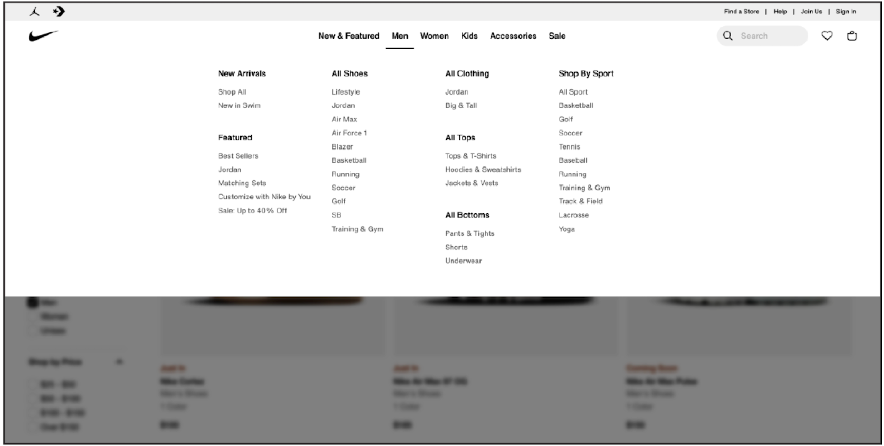 Nike 它的導航很多,但分了類、留了空,還用線分組,看著依然很清楚。有人可能告訴過你"導航選項不能超過七個,這是米勒定律規定的"這種說法是錯誤的。