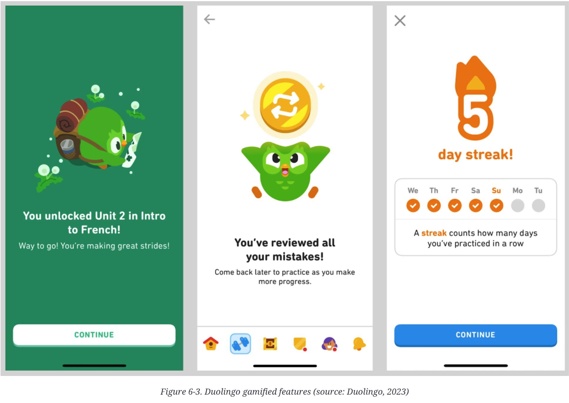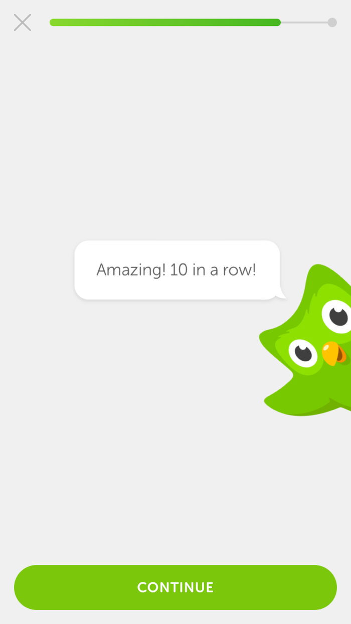 Duolingo 用卡通吉祥物鼓勵學習;完成問題時給予及時反饋;讓使用者在語言學習中獲得情緒正向回報。
