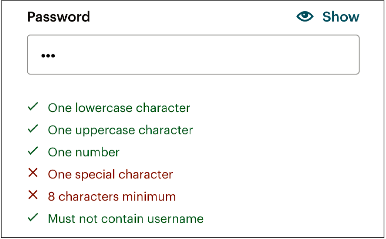 當使用者建立賬戶時,太複雜的密碼要求會讓人感到煩惱。Mailchimp 解決這個問題的方法很簡單:使用實時密碼驗證。這樣使用者可以立即看到密碼是否符合要求,既保證了安全,又減少了使用者的挫折感。