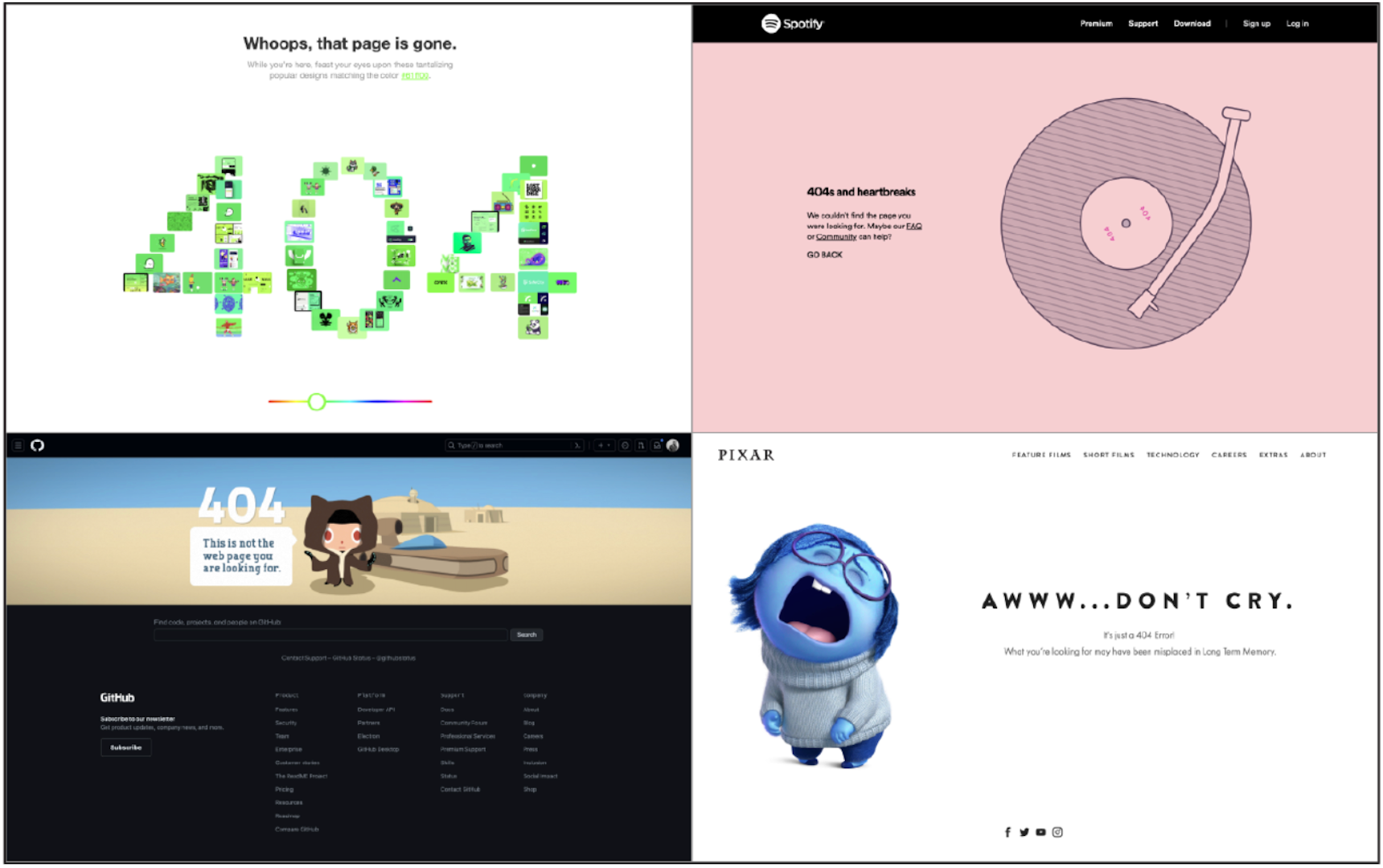 404 頁面:當網頁無法找到時,使用者可能會感到失望,從而形成負面印象。但有些公司利用這個機會,透過幽默和創意與使用者建立聯絡,並展示品牌個性。