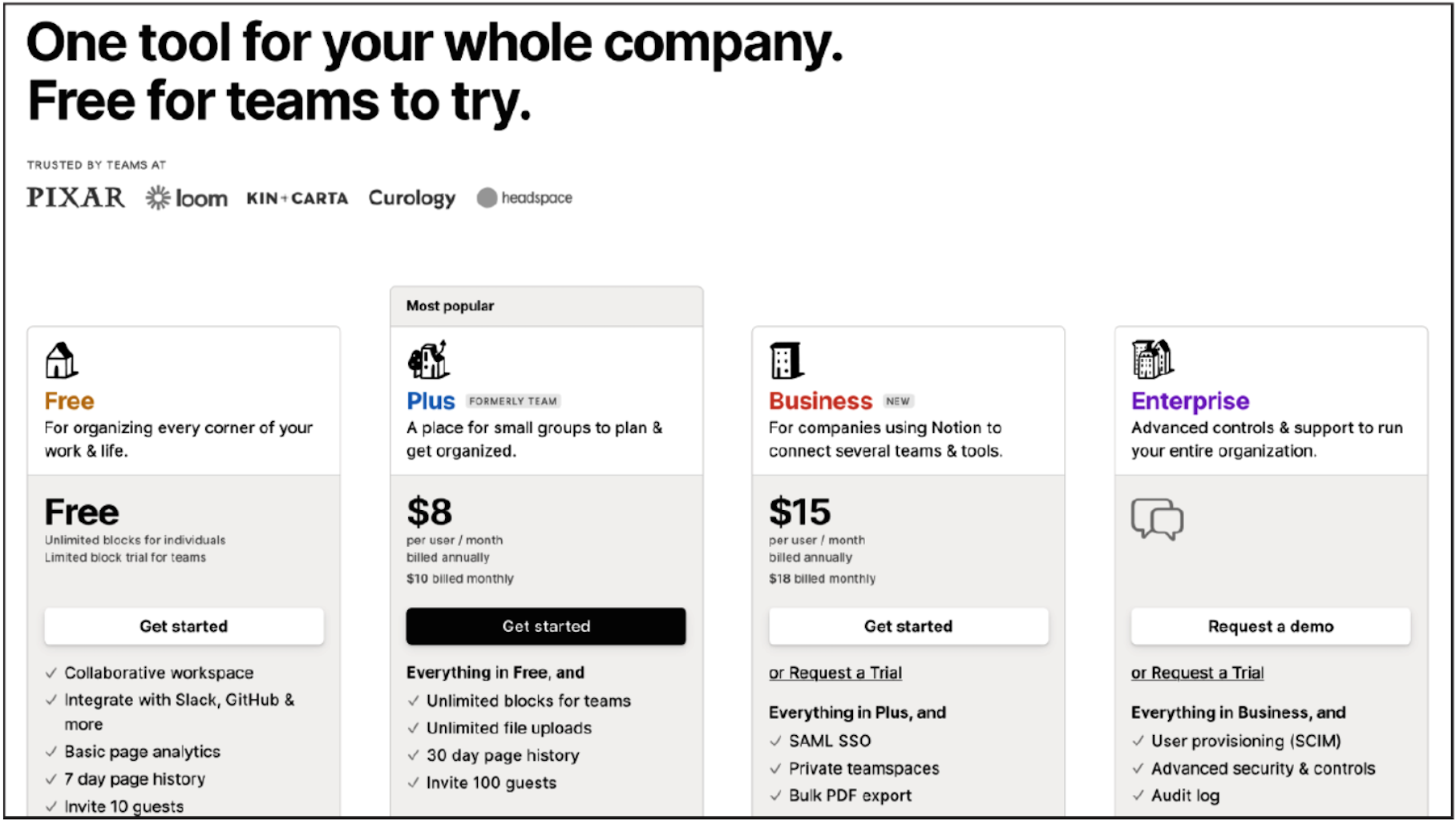Notion 的價格表中,“Plus”套餐被標為“Most popular”,在視覺上更顯眼。在訂閱服務的價格表中,常用視覺線索強調某個推薦套餐:顏色加深(例如深色“Get started”按鈕)。尺寸略大。位置靠近中央。