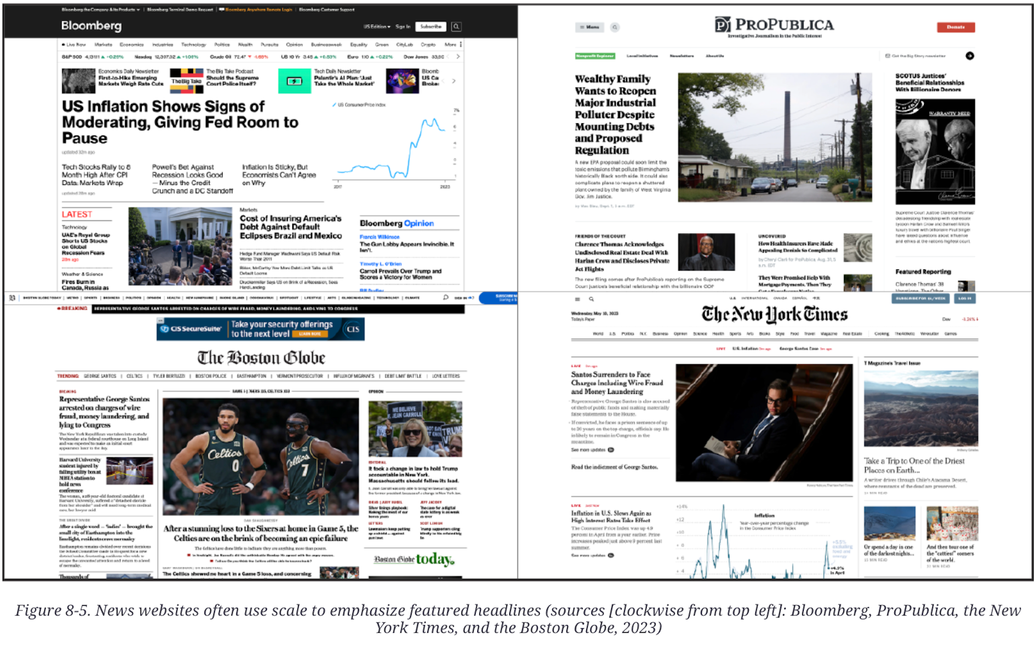 Bloomberg、ProPublica、《紐約時報》和《波士頓環球報》都會用比例和版式突出重要新聞。使用更大的標題字型和圖片。在版面中打破列的佈局,形成視覺突圍效果。