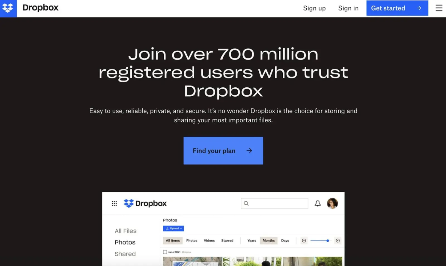 Dropbox 的頁面整體使用淡色調,但“註冊”按鈕通常使用高對比的藍色或紫色,瞬間抓住使用者視線。