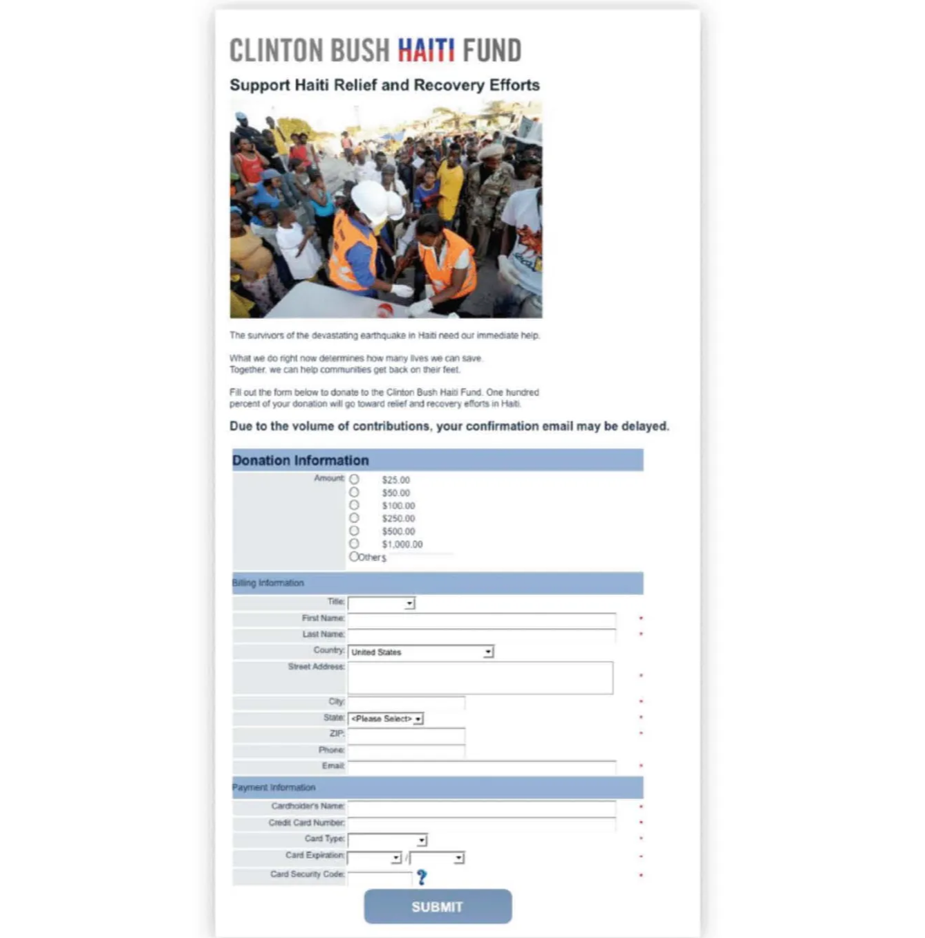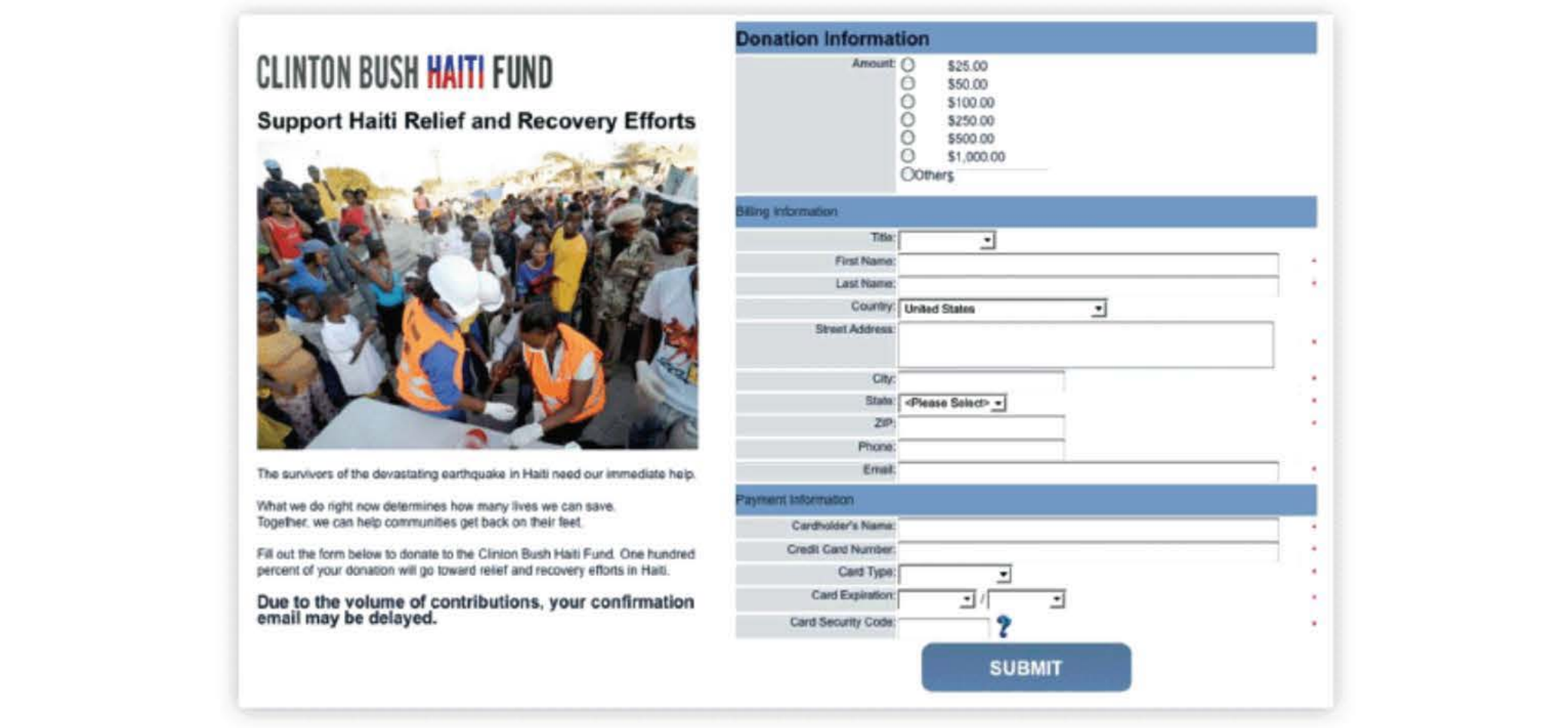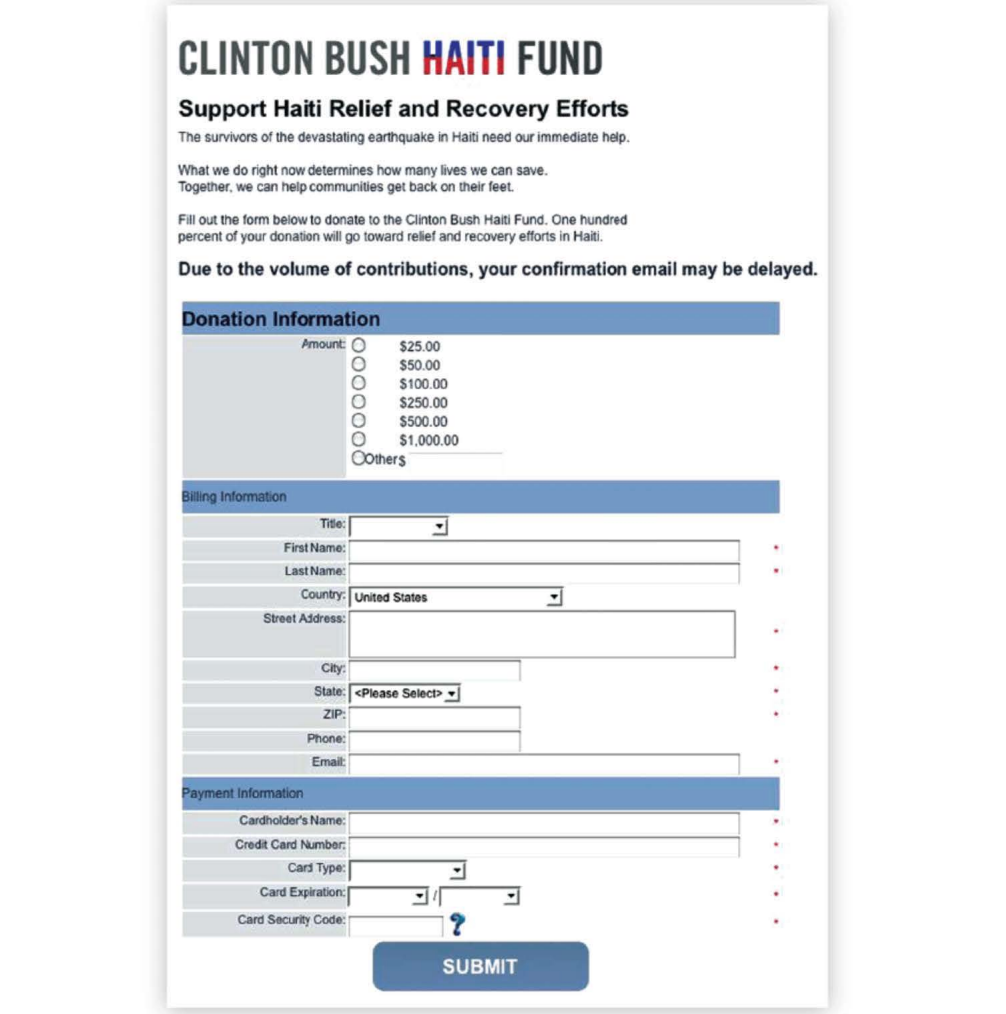 2010年1月,海地遭遇歷史第二嚴重地震。克林頓和小布什成立"海地賑災基金"籌款救援,匆忙搭建的捐款頁面每天吸引數百萬訪問,但人手不足,僅靠一位IT人員支撐。