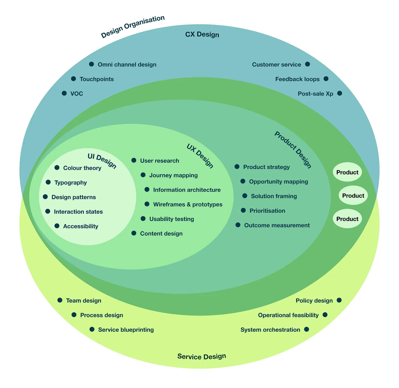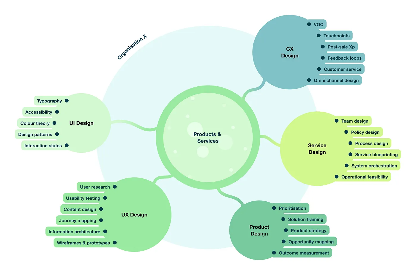 和之前“同心圓結構”完全不同,它打破了層級感,讓不同職能(UI、UX、產品、CX、服務設計)都像是平等的節點,圍繞一個共同目標產品與服務(Products & Services)進行互動。