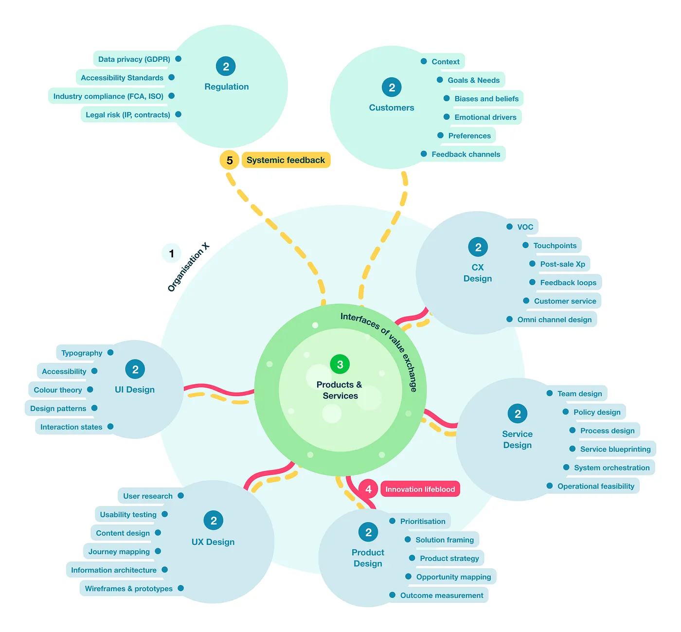 中心是“Products & Services”(產品與服務)周圍有5個設計能力點:UI、UX、產品設計、CX、服務設計,每個設計職能都向中心連出“紅線”代表創新流動(lifeblood),外部還有“黃色虛線”代表反饋系統,連著外部力量(如客戶、法規)