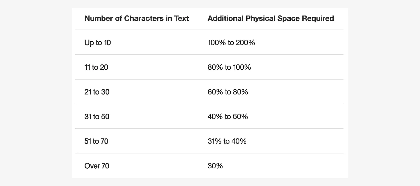 IBM 的全球化設計網站也提供了一個翻譯長度參考表,列出各語言相對於英文平均增長的字元比例。例如:德語:+30%法語:+20%西班牙語:+25%。這類參考表可以幫助設計師科學預留文字空間,避免上線後問題頻發。