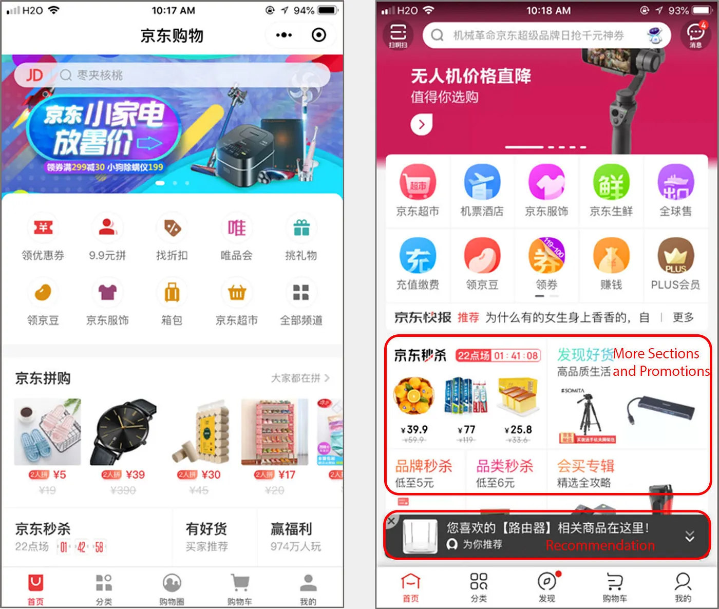 中國應用通常在單屏展示更多資訊,使用者也習慣在"超級應用"中看到大量資訊和功能入口。