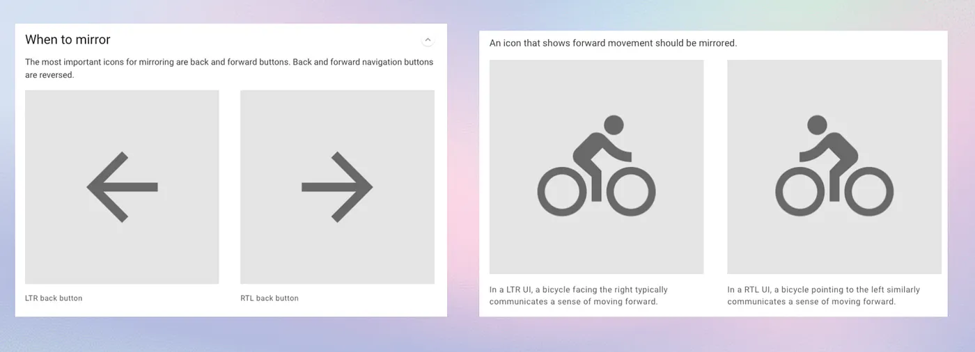 谷歌的 Material Design 已制定了相關規則,確保圖示順序、介面邏輯與語言習慣相匹配。