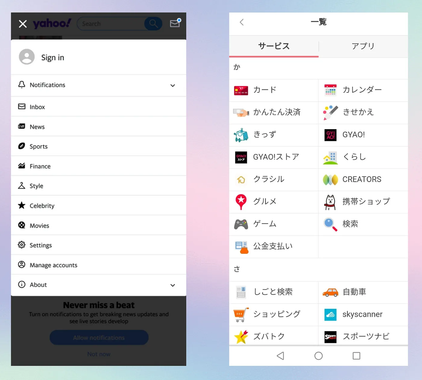 選單對比也很明顯:英文版簡潔高層級,而日文版選單極長,涵蓋房產、遊戲、天氣、機票、占星等。