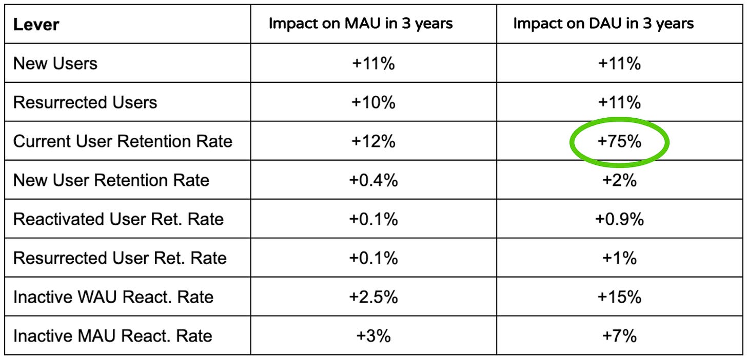 我們還發現了另一個有趣的現象:不同指標對日活使用者(DAU)和月活使用者(MAU)的影響差別很大。比如,提高當前使用者留存率對提升日活的效果是提升月活效果的6倍。