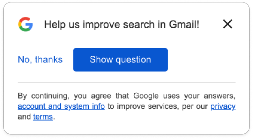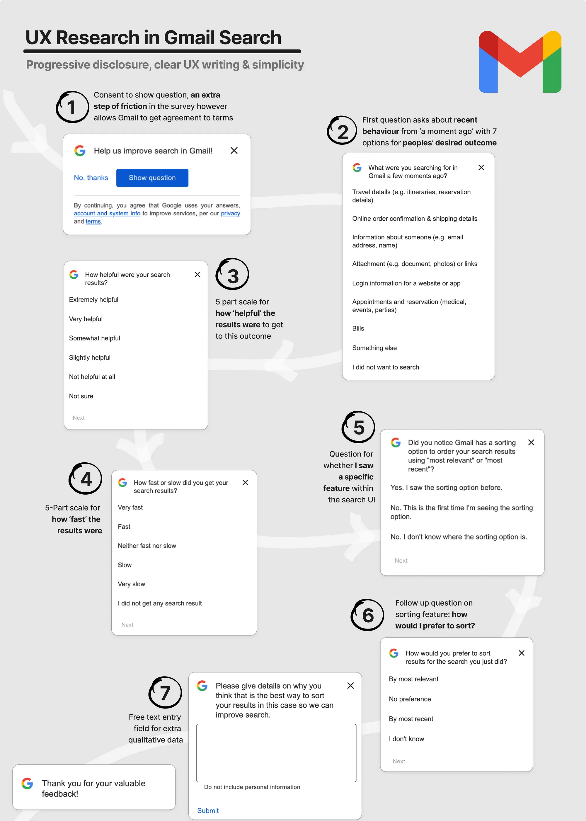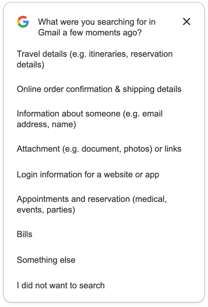 Gmail首先想了解使用者的搜尋目的和搜尋內容。團隊可能是透過搜尋詞分析或使用者研究得出這些類別。調查在搜尋後即時顯示以確保準確反饋。這個問題與後續問題結合,能全面評估搜尋體驗。