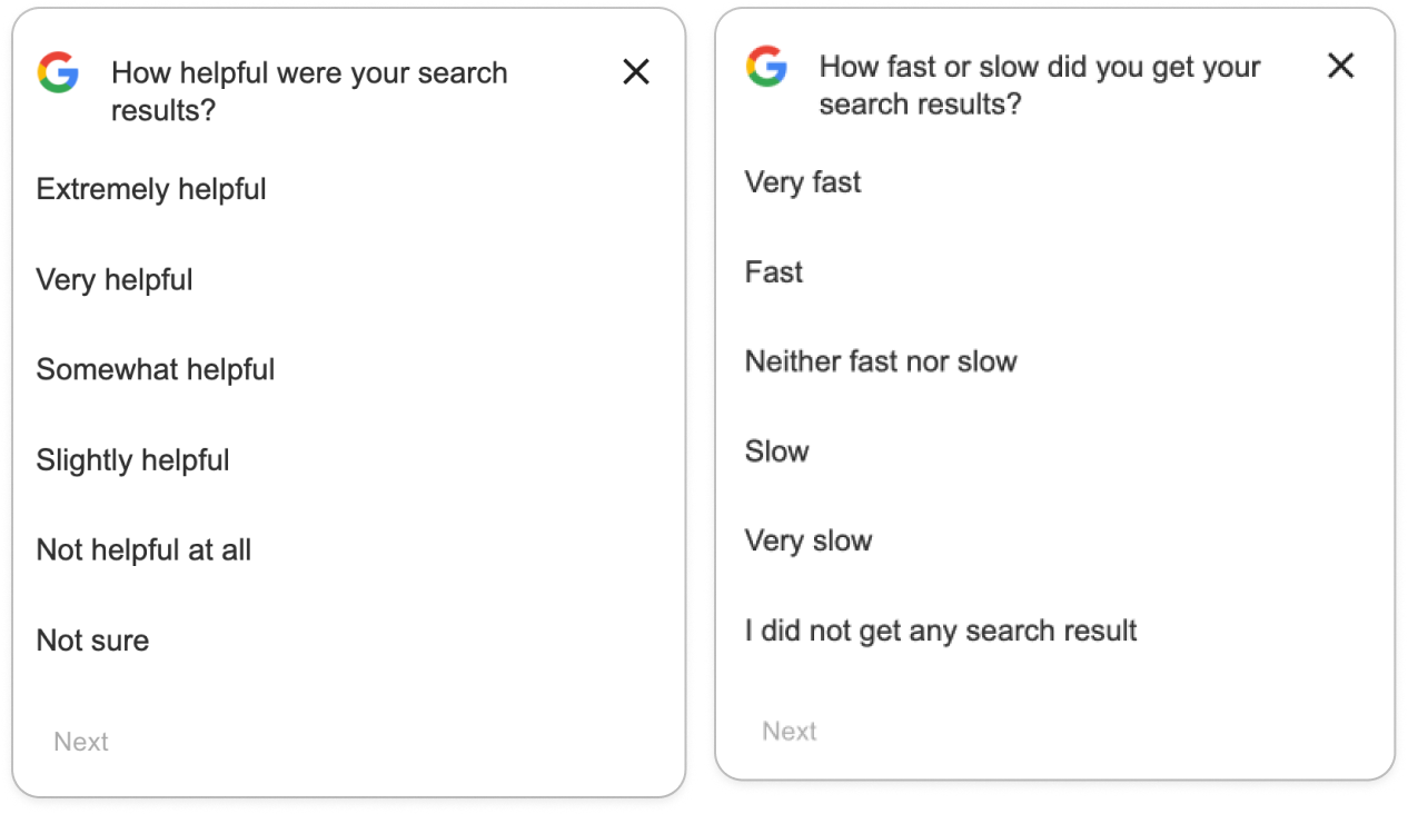 調查使用兩個效能問題評估:結果有用程度(從"非常有幫助"到"完全沒幫助")和搜尋速度(從"很快"到"沒有得到結果")。使用者即使提前退出,團隊也能獲得三個關鍵指標: