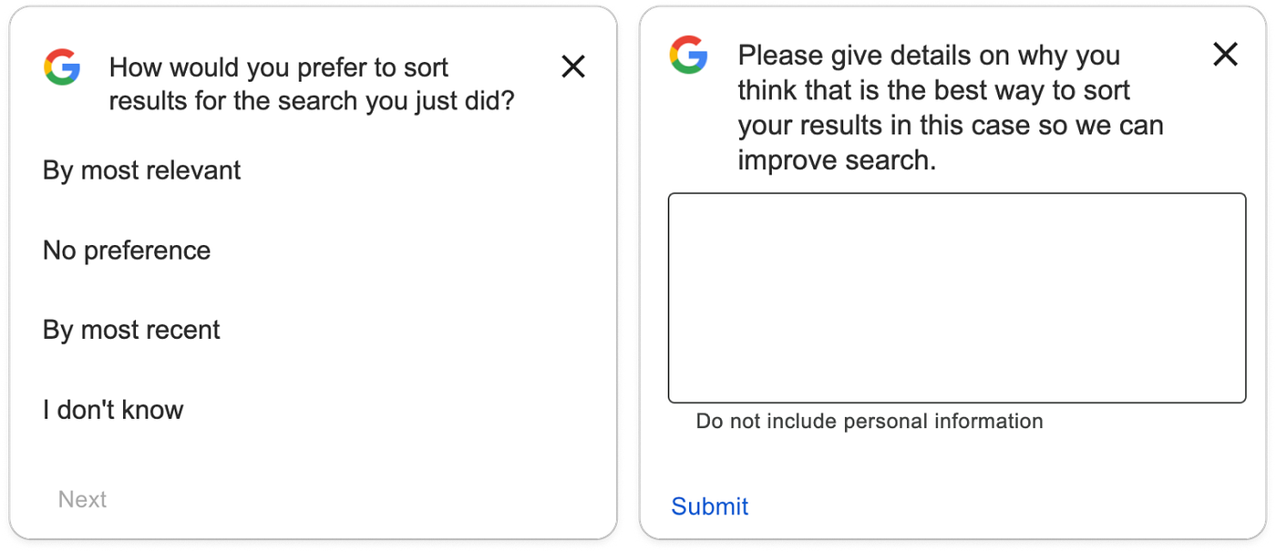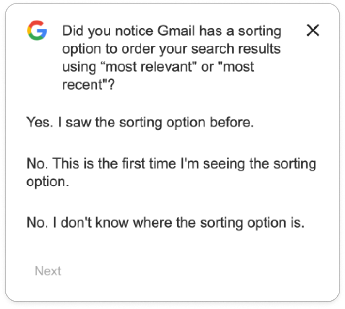 Gmail在調查中提出有趣問題:使用者是否發現搜尋有"最相關"和"最新"兩種排序選項?選項包括:之前見過、首次看到、不知位置。
