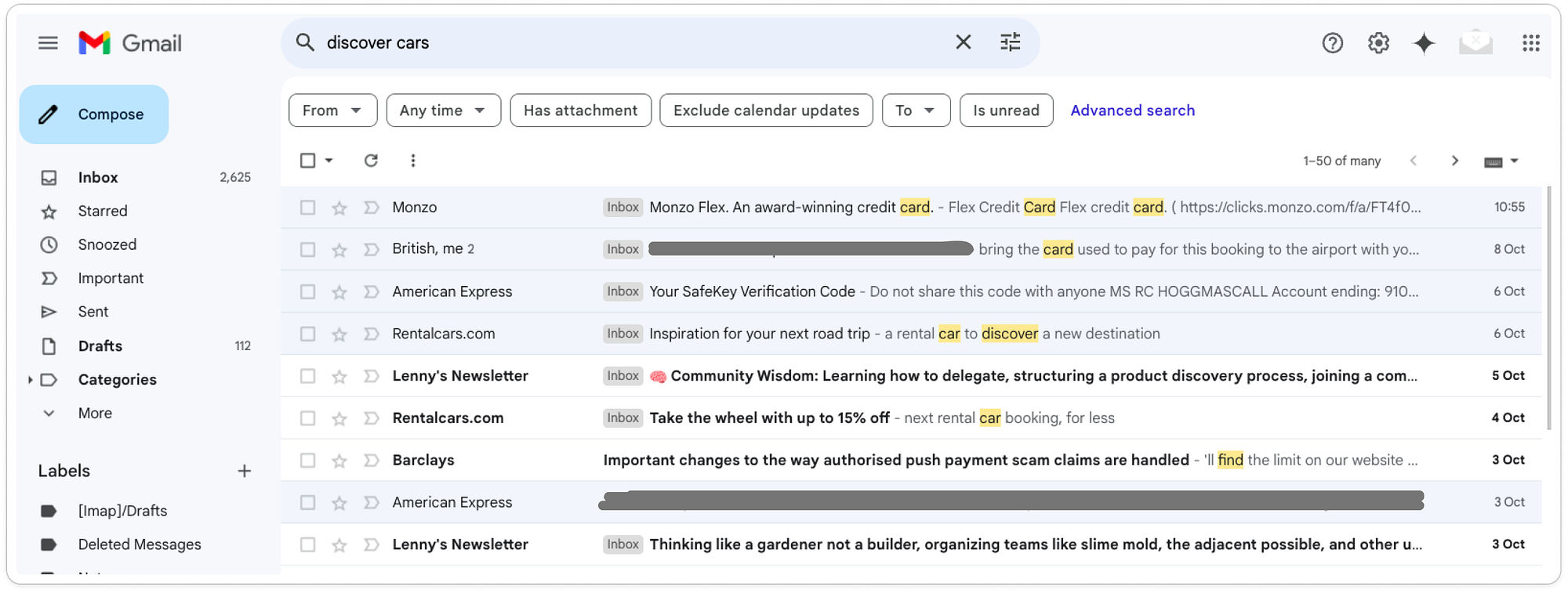 搜尋結果很困惑:為什麼匹配度更高的租車郵件反而排在 Lenny's newsletter 後面?