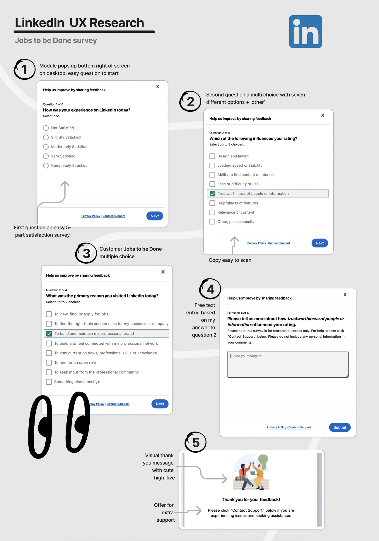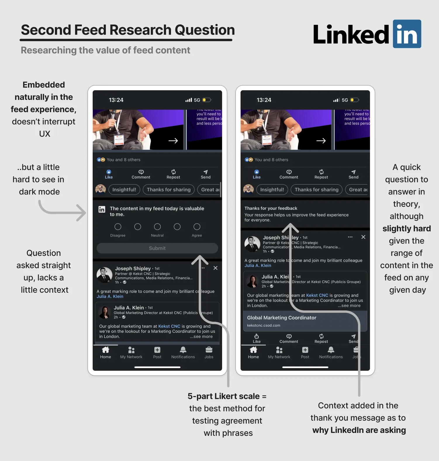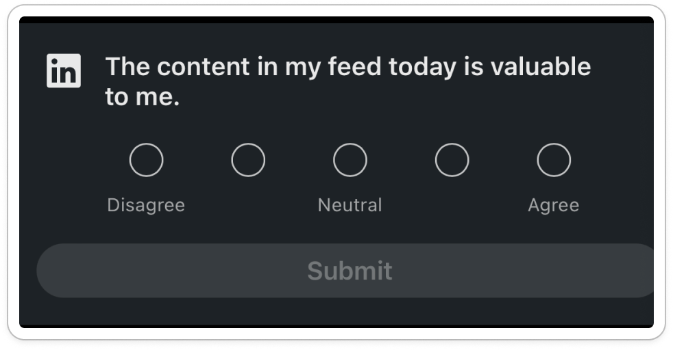 "我的資訊流內容對我很有價值" 使用者可在5分量表上從"不同意"到"同意"進行評分。這類簡單調查主要用於快速檢查使用者體驗,LinkedIn可能想要獲得比傳統指標更直觀的使用者反饋。