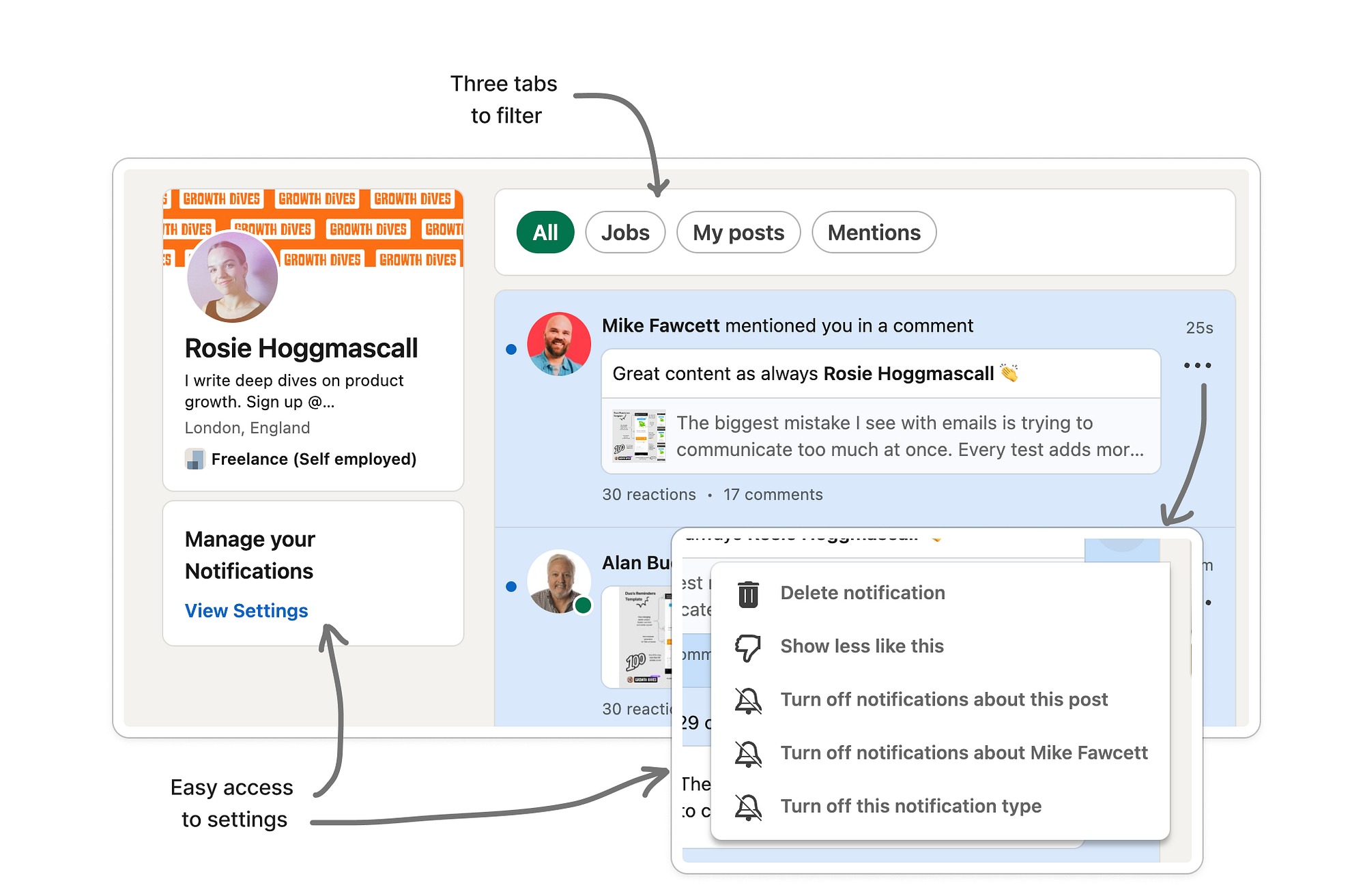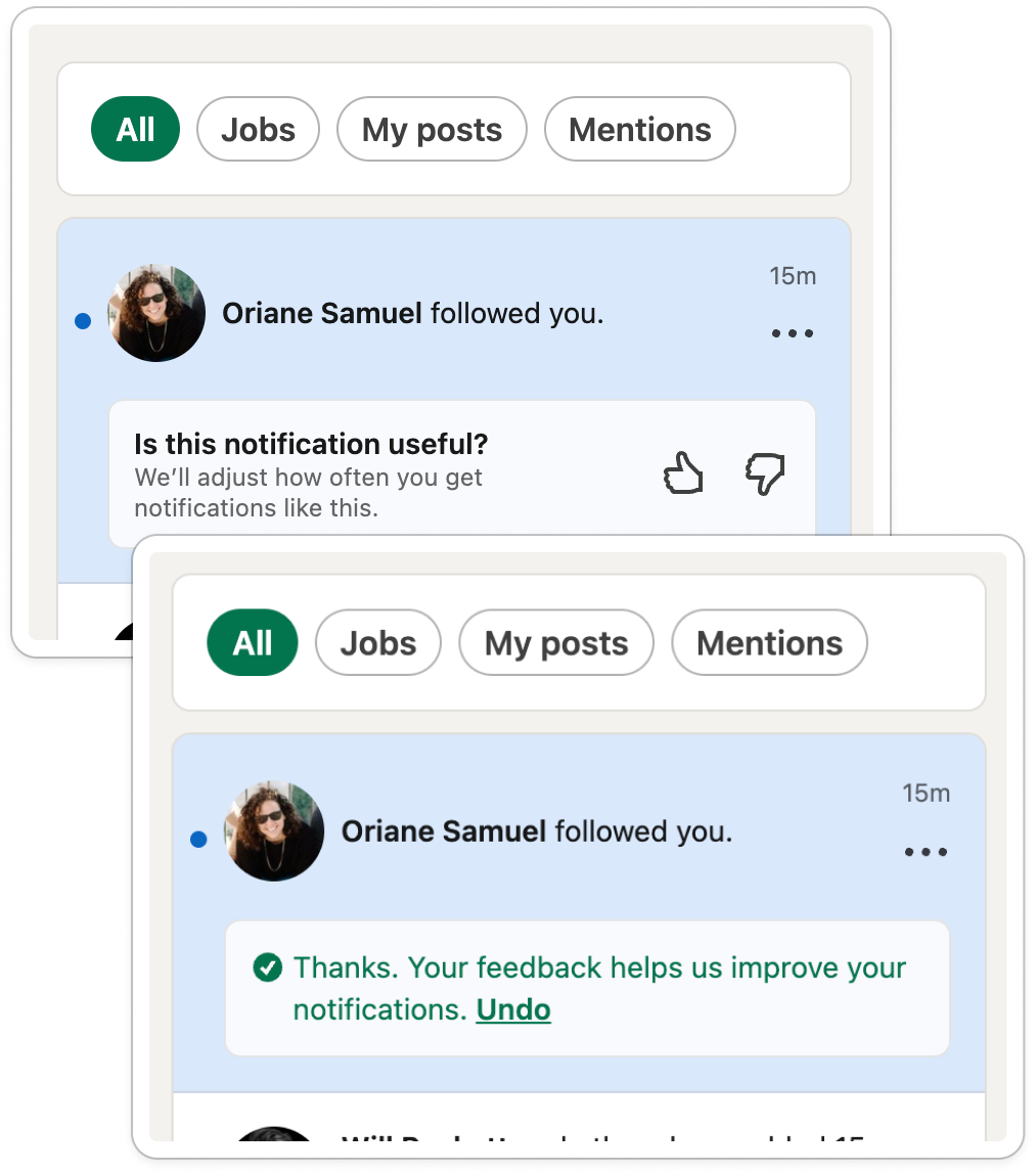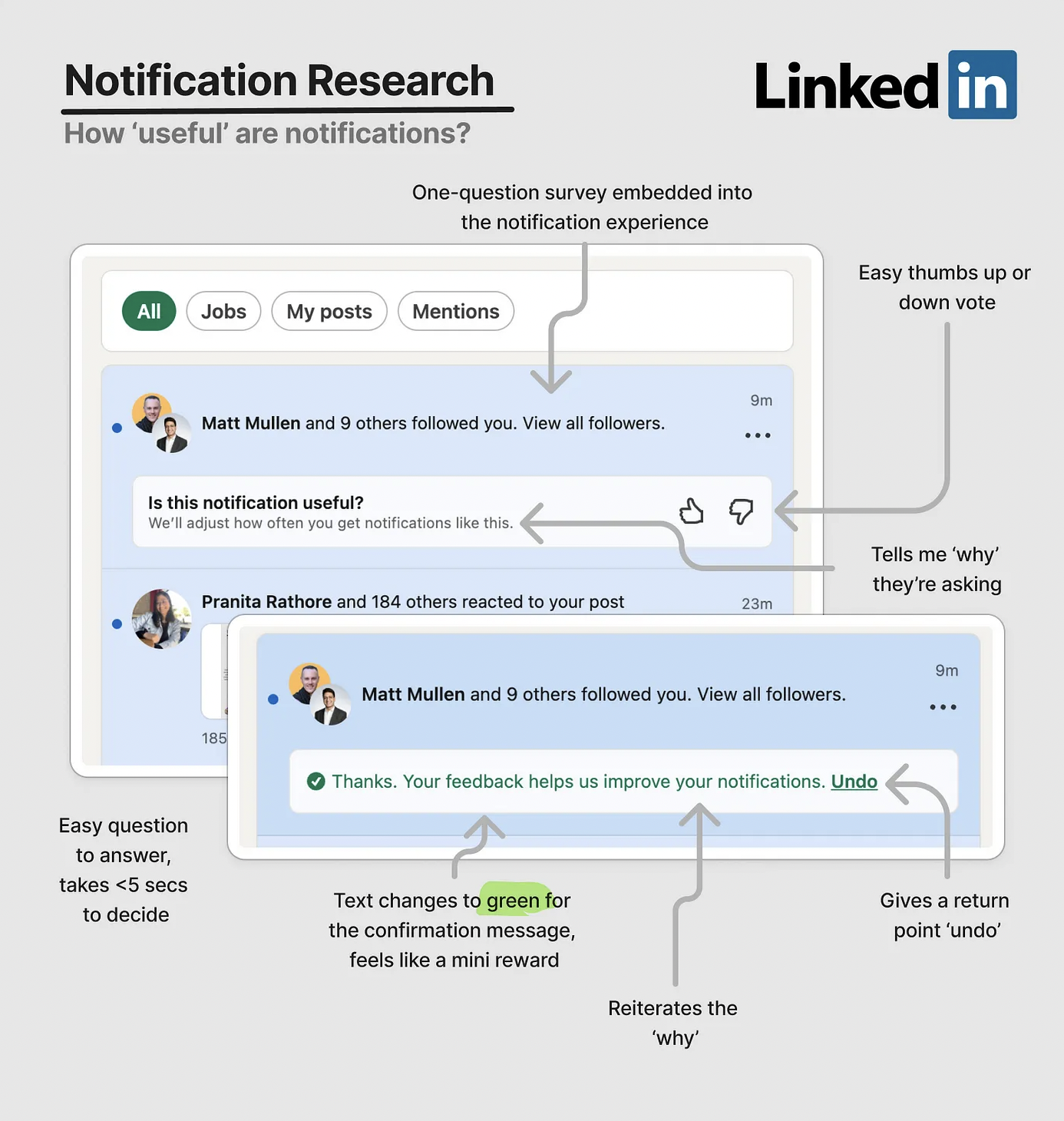LinkedIn近期最佳化了通知功能,解決了之前容易錯過重要訊息而被低價值通知佔據的問題。透過使用者調研改進了通知系統,現在會詢問"這條通知對你有用嗎?"並根據反饋調整通知頻率。