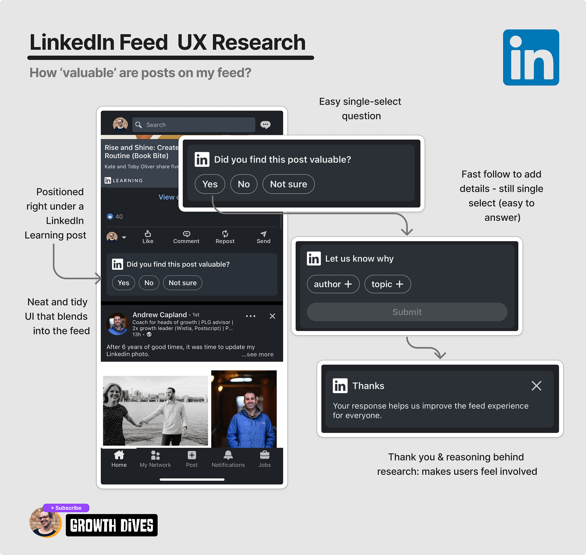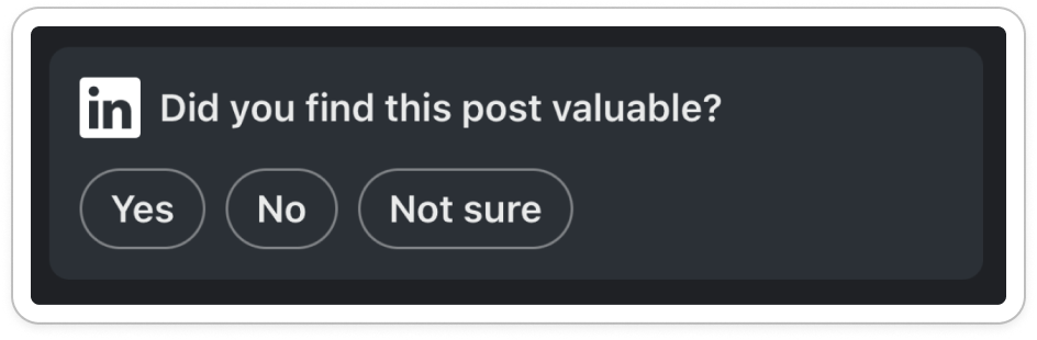 團隊以AI為工具思考如何更好地實現這些目標,而非簡單地新增AI功能。LinkedIn透過簡單調查持續最佳化:這篇內容對你有價值嗎?