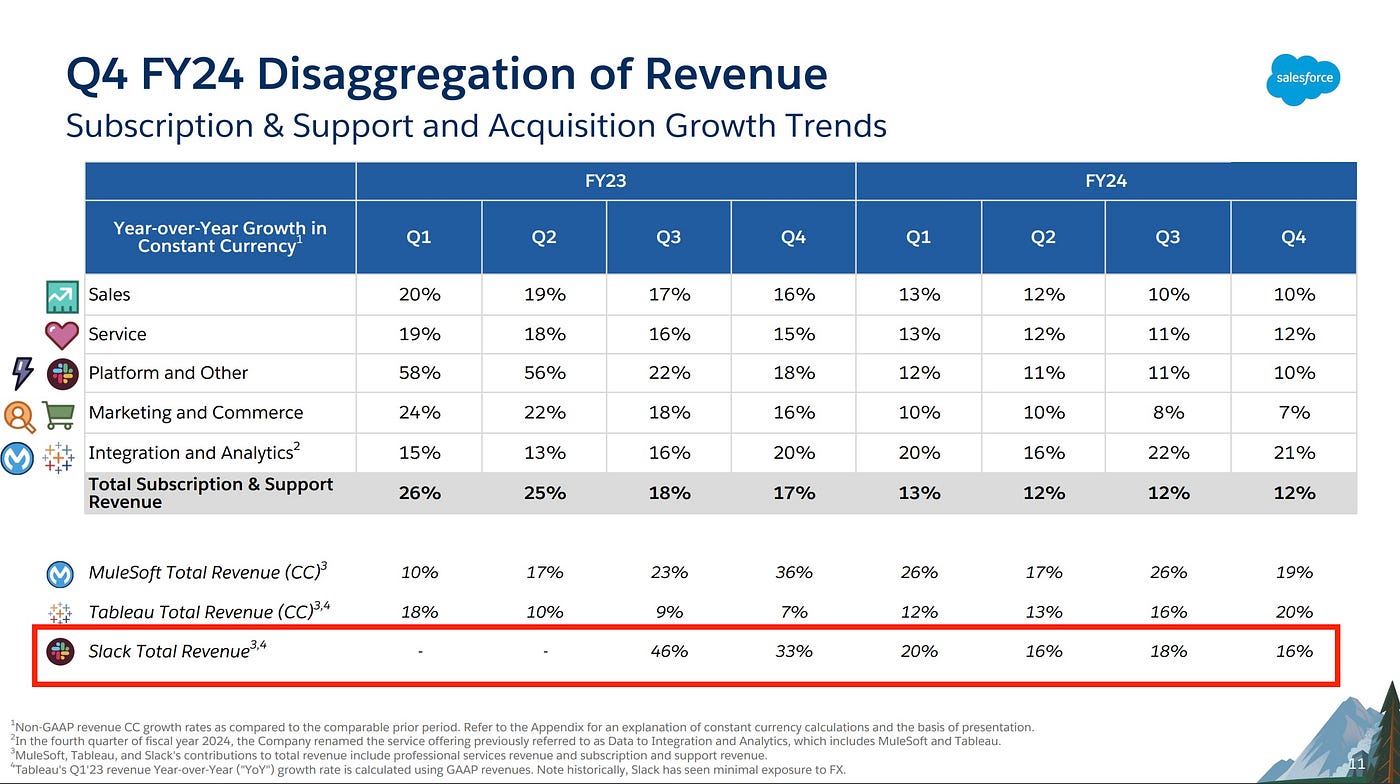 Slack 是創業界的傳奇,從 Glitch 遊戲失敗後轉型為團隊溝通工具。8個月內就達到獨角獸估值。2013 年推出後快速增長,到 2019 年日活使用者達 1000 萬,歸功於遠端辦公趨勢和產品驅動增長。2021 年被 Salesforce 以 277 億美元收購,但增長從 2023 年的 46% 降至 2024 年的 16%。