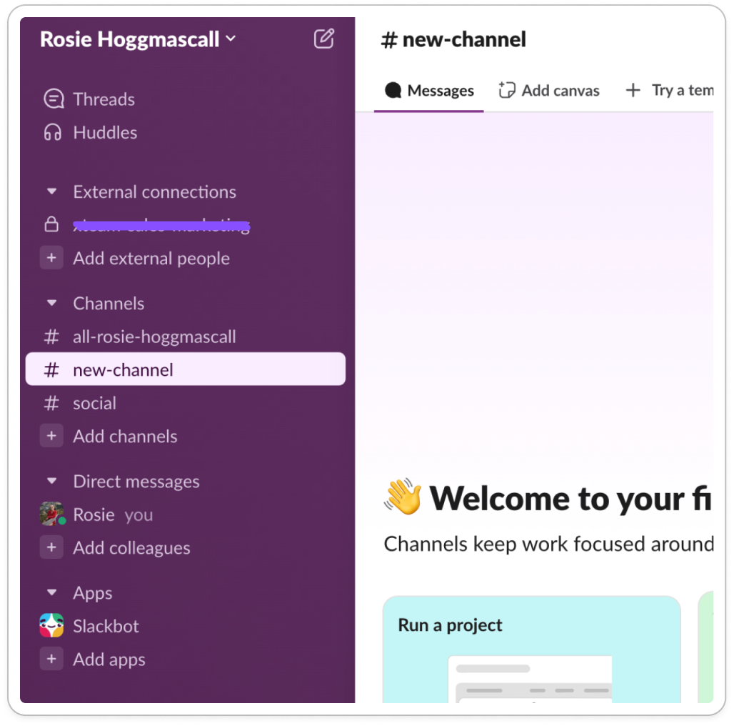 建立Slack工作區並用Slack Connect接受客戶邀請,作為新使用者試用後,頻道的空狀態設計。