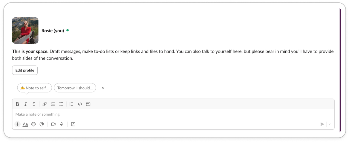 Slack甚至為自己和自己的私聊設計了空狀態。Slack透過預判使用者需求,降低使用門檻,引導完成關鍵步驟。這種自然融入的引導方式,比傳統的提示和彈窗更有效。