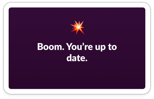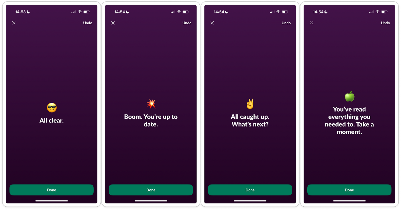 Slack移動端的"追趕進度"功能讓使用者可以透過左右滑動快速瀏覽訊息。瀏覽完成後會顯示一條簡短的祝賀語。和搜尋欄類似,瀏覽完成提示也會隨機變化,風格從輕鬆到熱情不等: