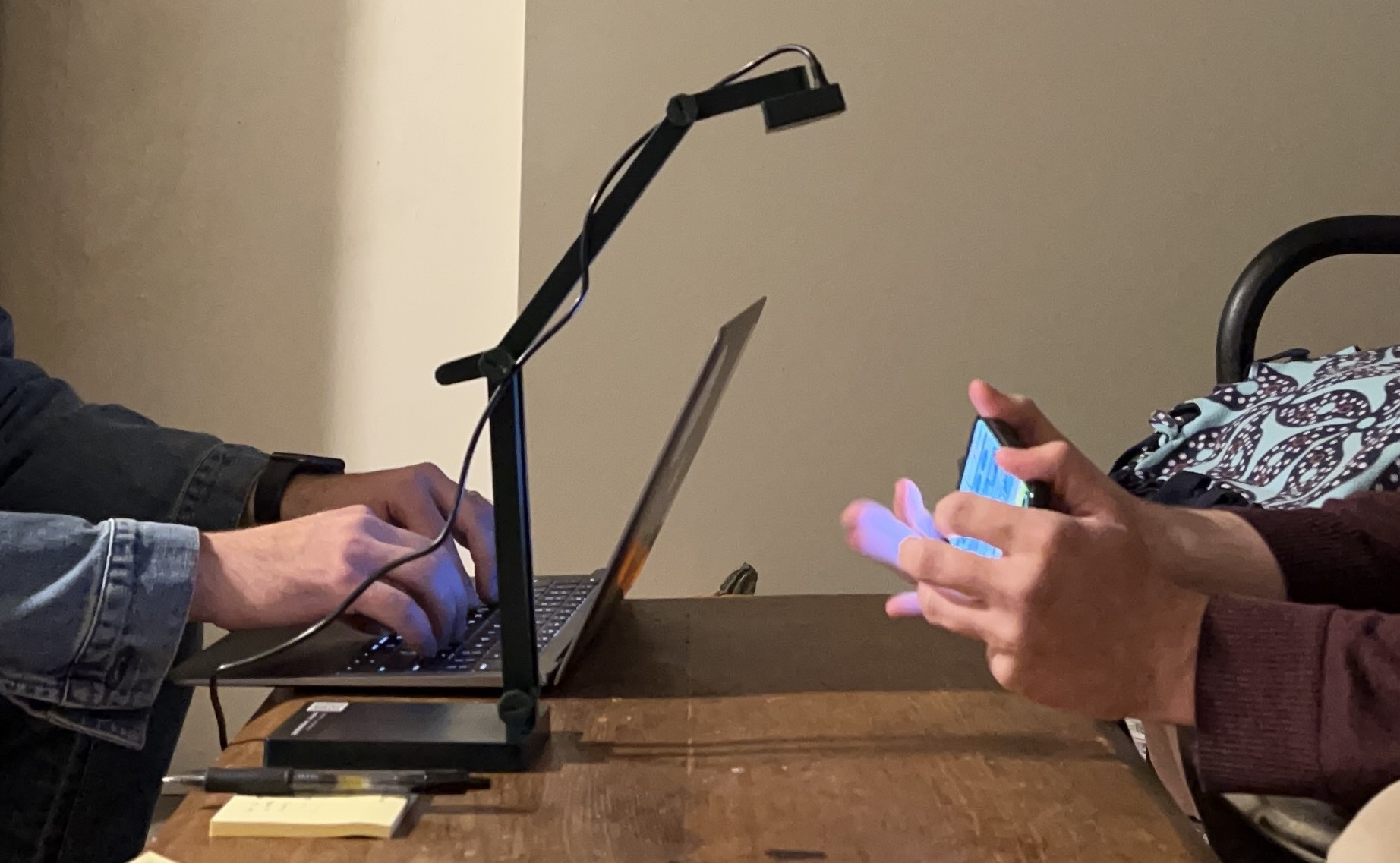 面對面研究能夠讓參與者在自己熟悉的環境中更輕鬆地參與,也有利於研究者觀察他們如何操作裝置。面對面的測試能夠讓研究者收集到更多細節,比如參與者如何使用外接的盲文鍵盤,或是他們如何依靠肢體語言和面部表情反饋操作。