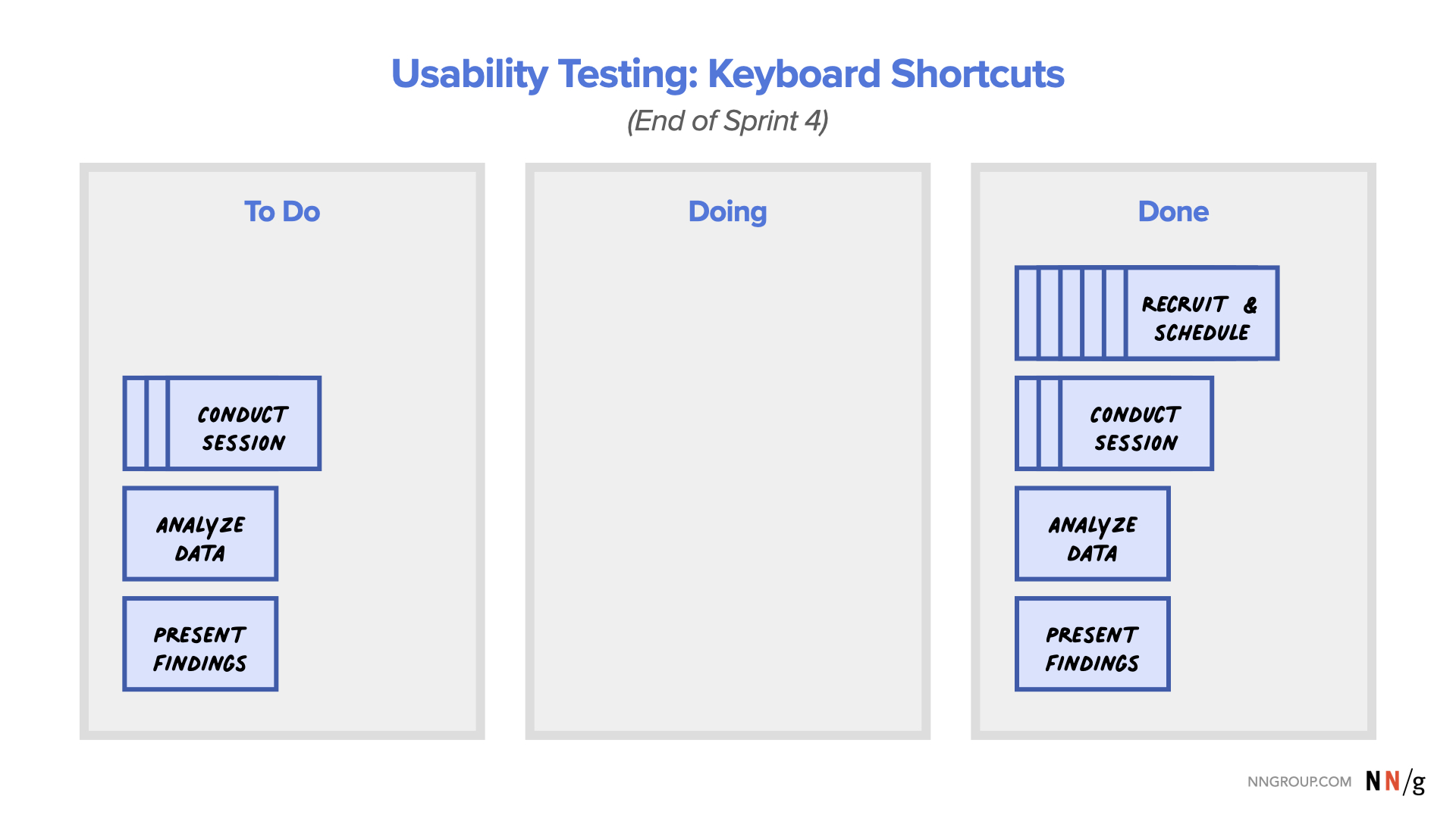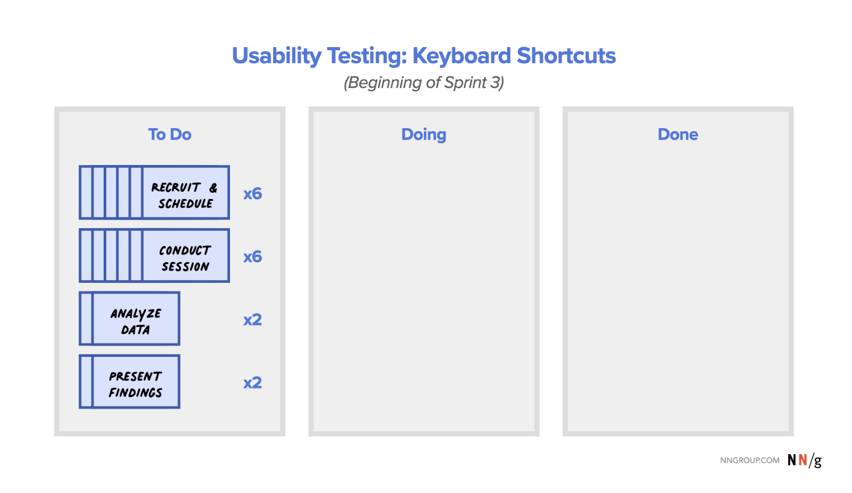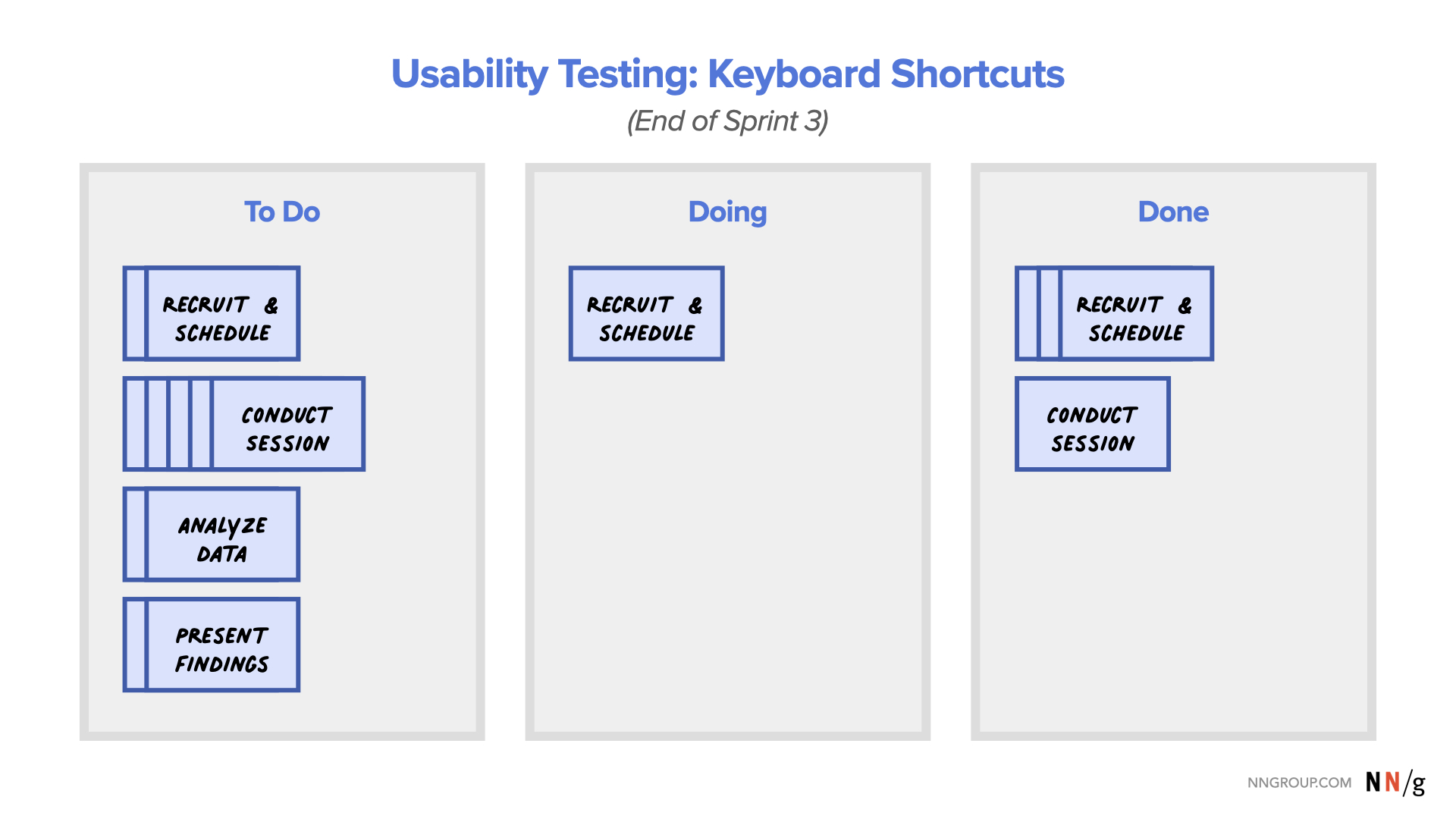 每個參與者對應一個招募、安排和測試的任務,隨後還會有資料分析和報告任務。這些任務可以分階段完成,並在每次迭代結束時彙報進展。