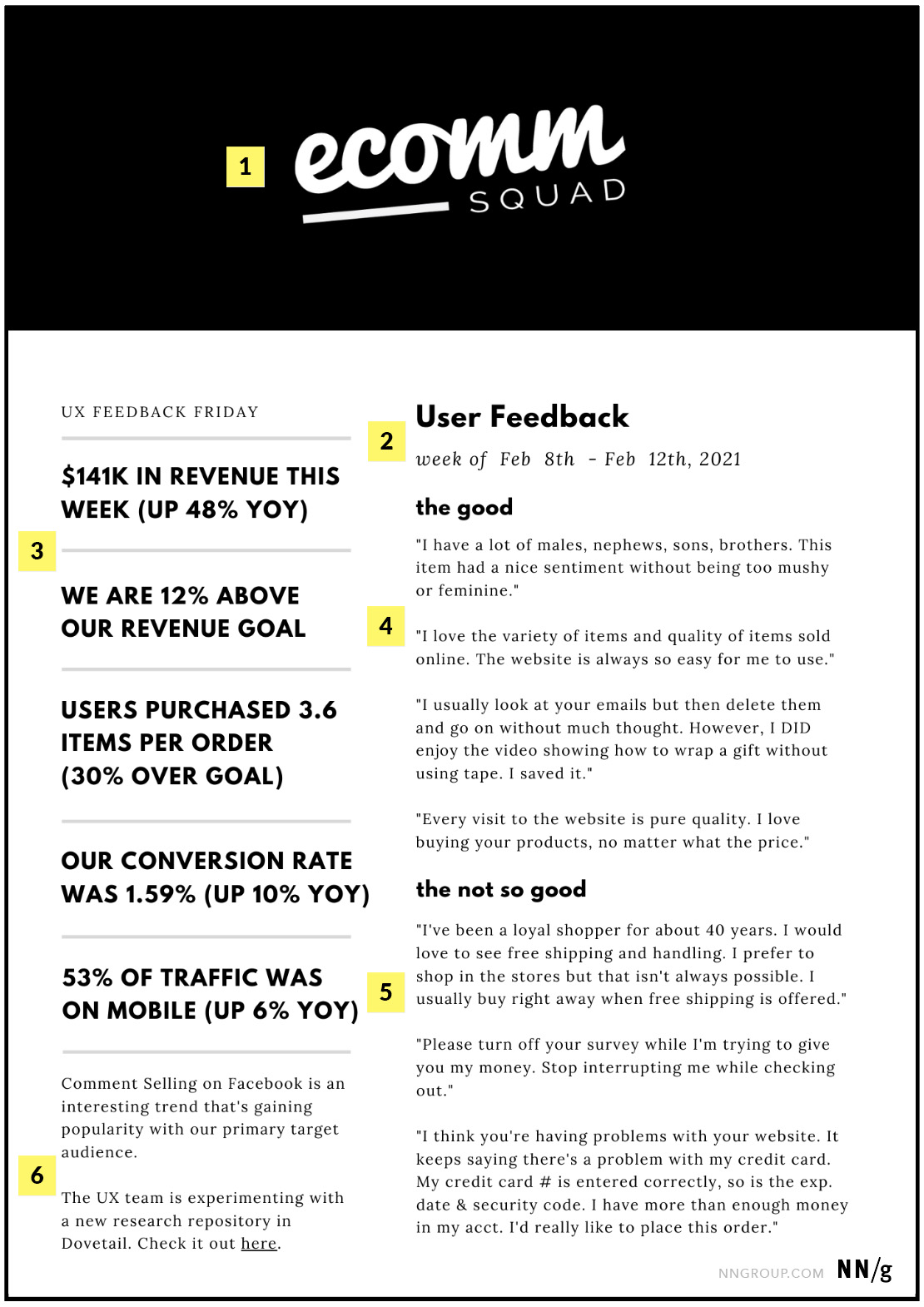 - 避免冗長:不要用冗長的PPT或複雜的圖表來溝通進展,簡短的郵件或總結往往更有效,比如可以起個有趣的名字,如“UX反饋週五”,讓團隊成員期待每週收到簡潔的進展彙報。