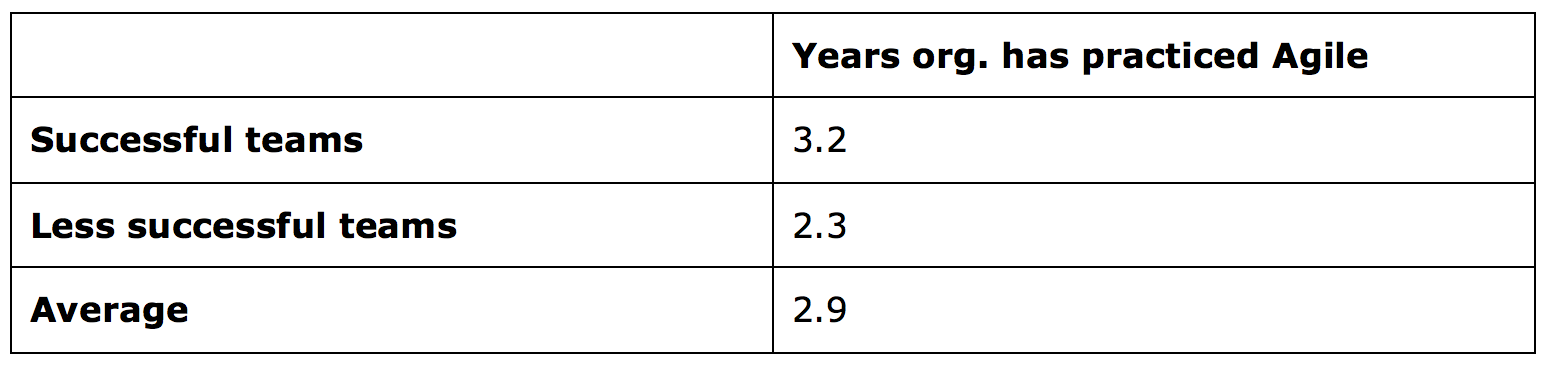 豐富的敏捷經驗:成功的敏捷團隊通常有超過3年的敏捷實踐經驗,而表現較差的團隊則敏捷經驗不足。研究表明,敏捷的成功往往需要數年時間來完善。因此,對於剛剛採用敏捷的組織來說,雖然初期問題不可避免,但不應因此氣餒。