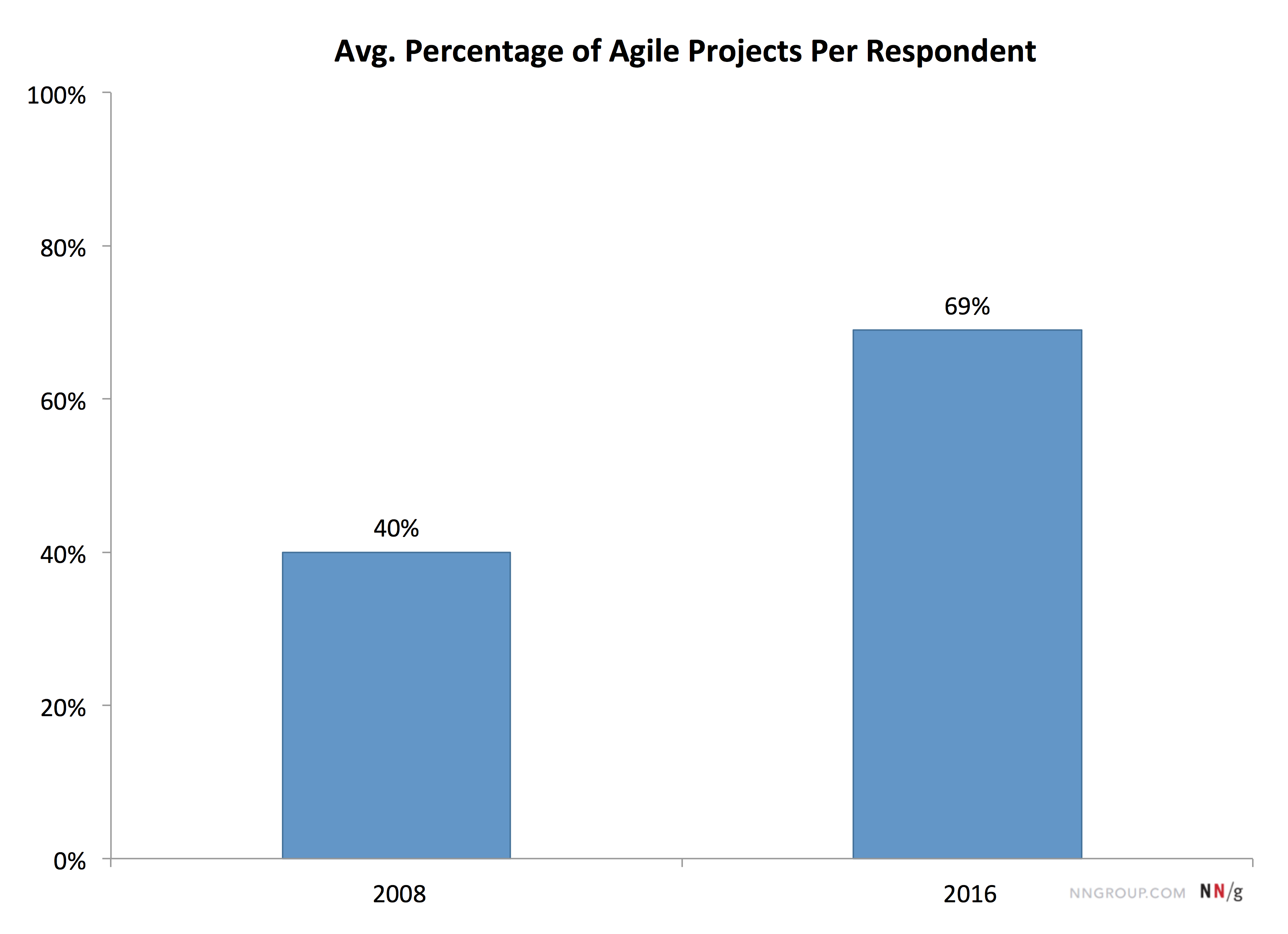 研究發現,UX已經在敏捷流程中逐漸融入使用者中心設計方法。雖然不存在通用的解決方案,每個組織都有其獨特的方式,但敏捷的普及率不斷增長。調查顯示,69%的專案使用了敏捷方法,而這一比例在2008年僅為40%。