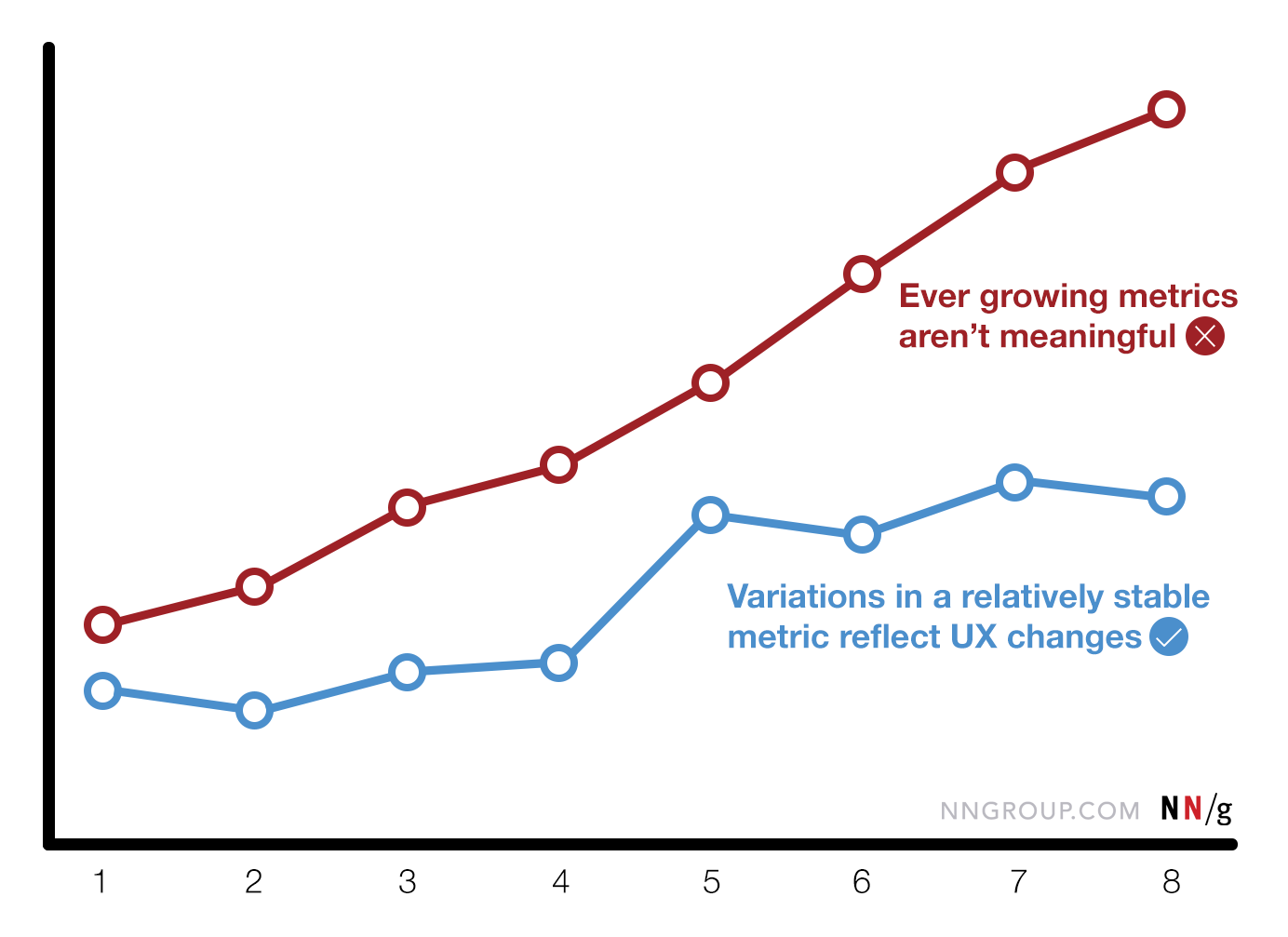 在資料分析中,所有追蹤的指標都應具備可操作性(Actionable),即指標的變化應當能夠反映使用者體驗的變化。而與之相對的虛榮指標(Vanity Metrics)雖然看起來很漂亮,但它們的波動通常無法關聯到實際操作,也不會為決策提供有價值的指導。