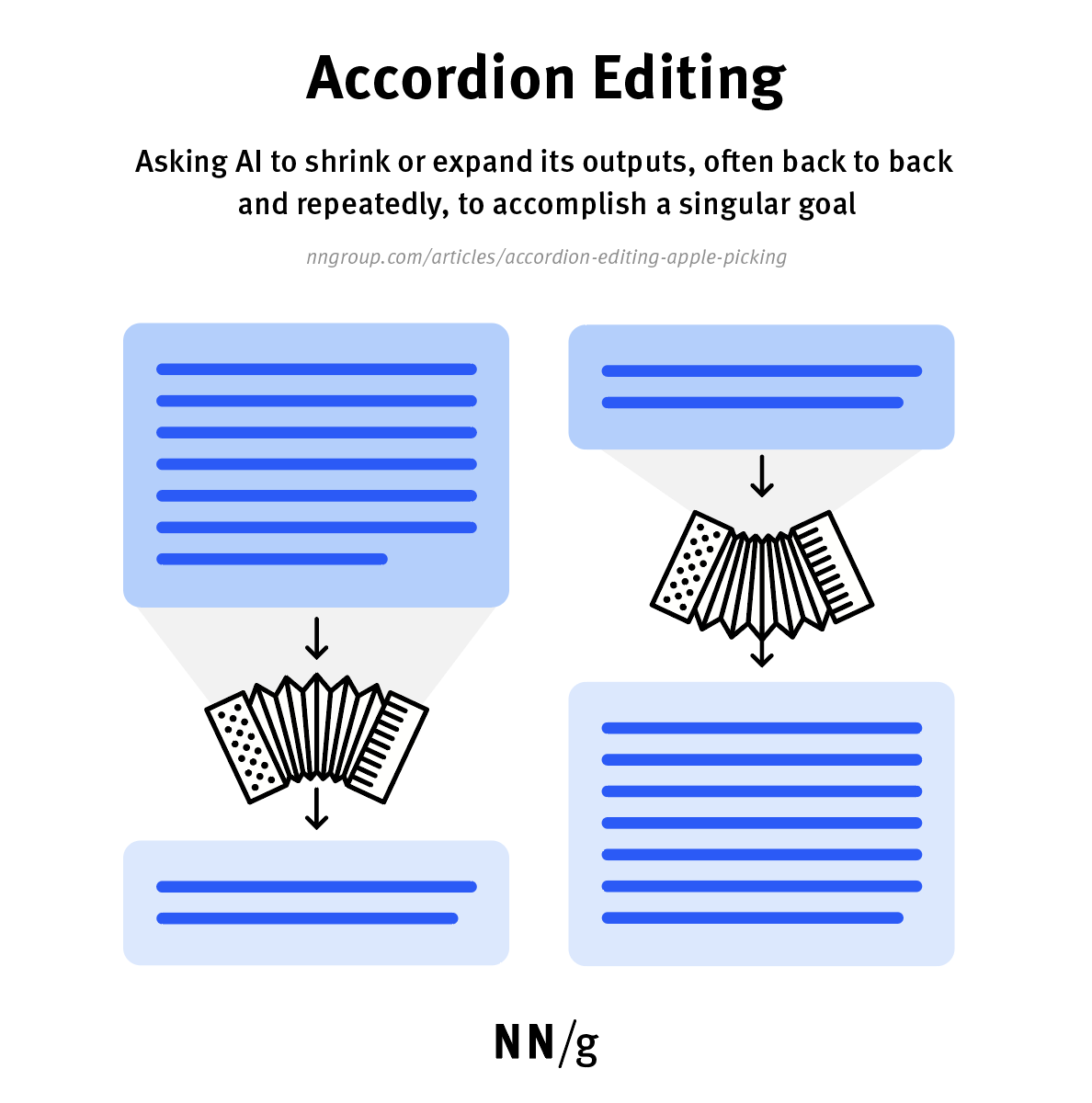 定義:手風琴式編輯發生在使用者要求AI縮小或擴充套件其輸出時,通常是反覆進行以完成單一目標。由於文字是一維媒介,不像影象,使用者被限制在一種簡單的線性互動方式中。除了文字的語氣或風格之外,最直接的特徵之一就是長度:讓它變長或變短,就像手風琴演奏者展開和收縮手風琴一樣。