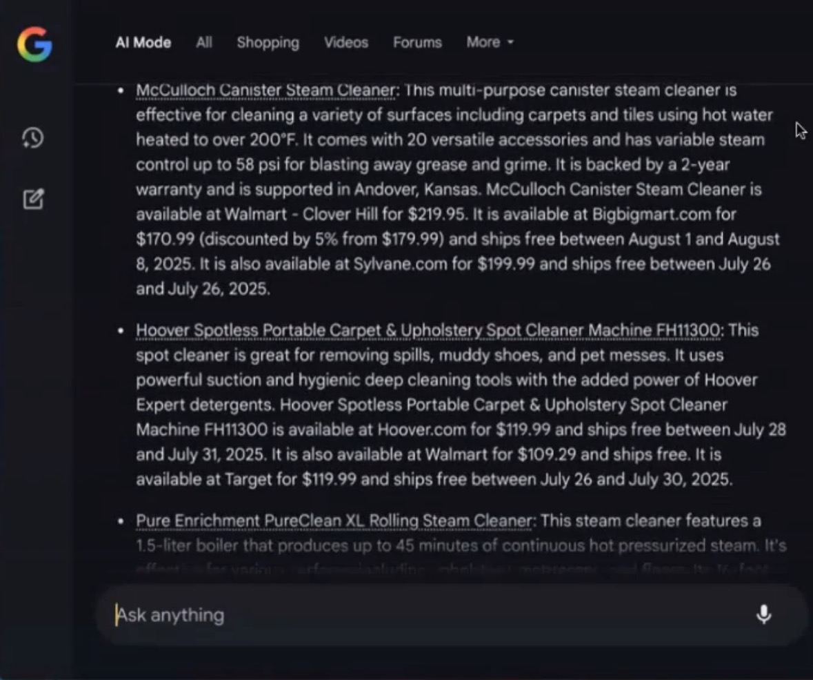 例如:一位使用者花了幾分鐘用 AI 模式找冰箱。她看到 LG 有個選項提到"ThinkQ 應用"。她覺得這個名字很奇怪,就問 AI 這是什麼。瞭解之後,她想回去看看剛才那臺 LG 冰箱。但她往上翻了很久都找不到,最後她想:要不直接讓 AI 再給一次連結算了。