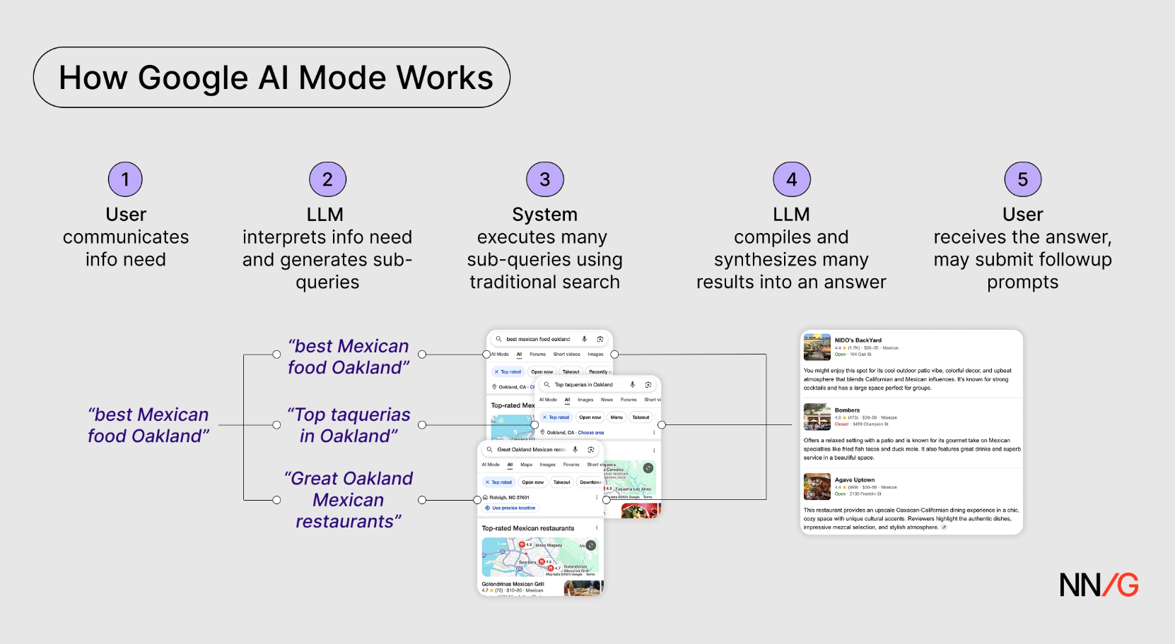例如,搜尋"奧克蘭最好的墨西哥美食"時,系統會自動執行多個子查詢(如"奧克蘭頂級墨西哥玉米捲餅店""奧克蘭優質墨西哥餐廳"),然後由 LLM 綜合結果並生成總結答案。本質上,AI 模式會解析使用者查詢,生成並執行多個相關搜尋,再整合資訊提供答案。