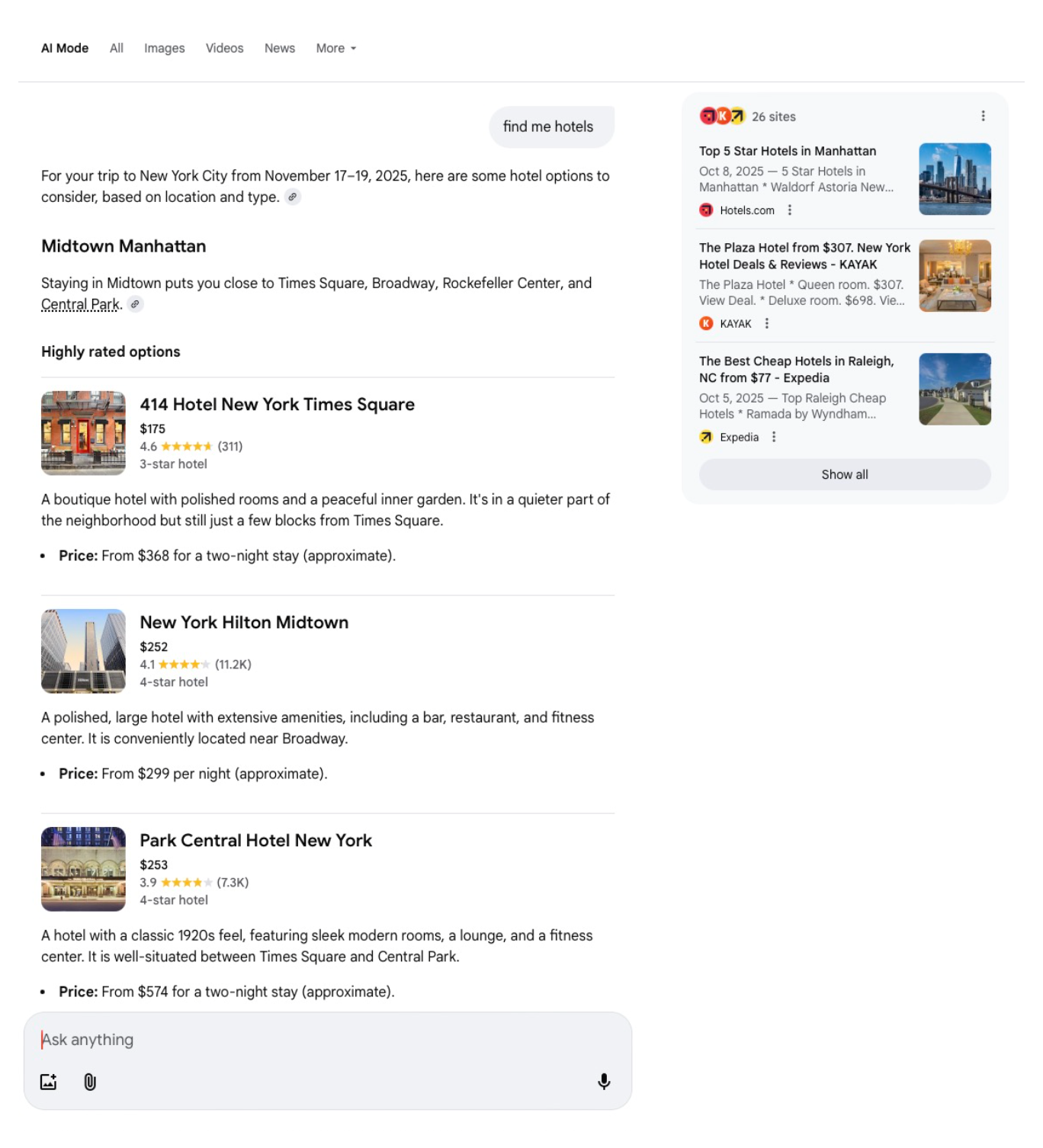 AI Mode 可呼叫 Google Maps、Shopping、YouTube 等產品的資料,如地圖評分、商品列表、影片等,極大增強搜尋結果的實用性與互動性。點選每個選項後,會展開一個互動式側面板,顯示詳細資訊,並提供使用者行程特定日期的價格報價。