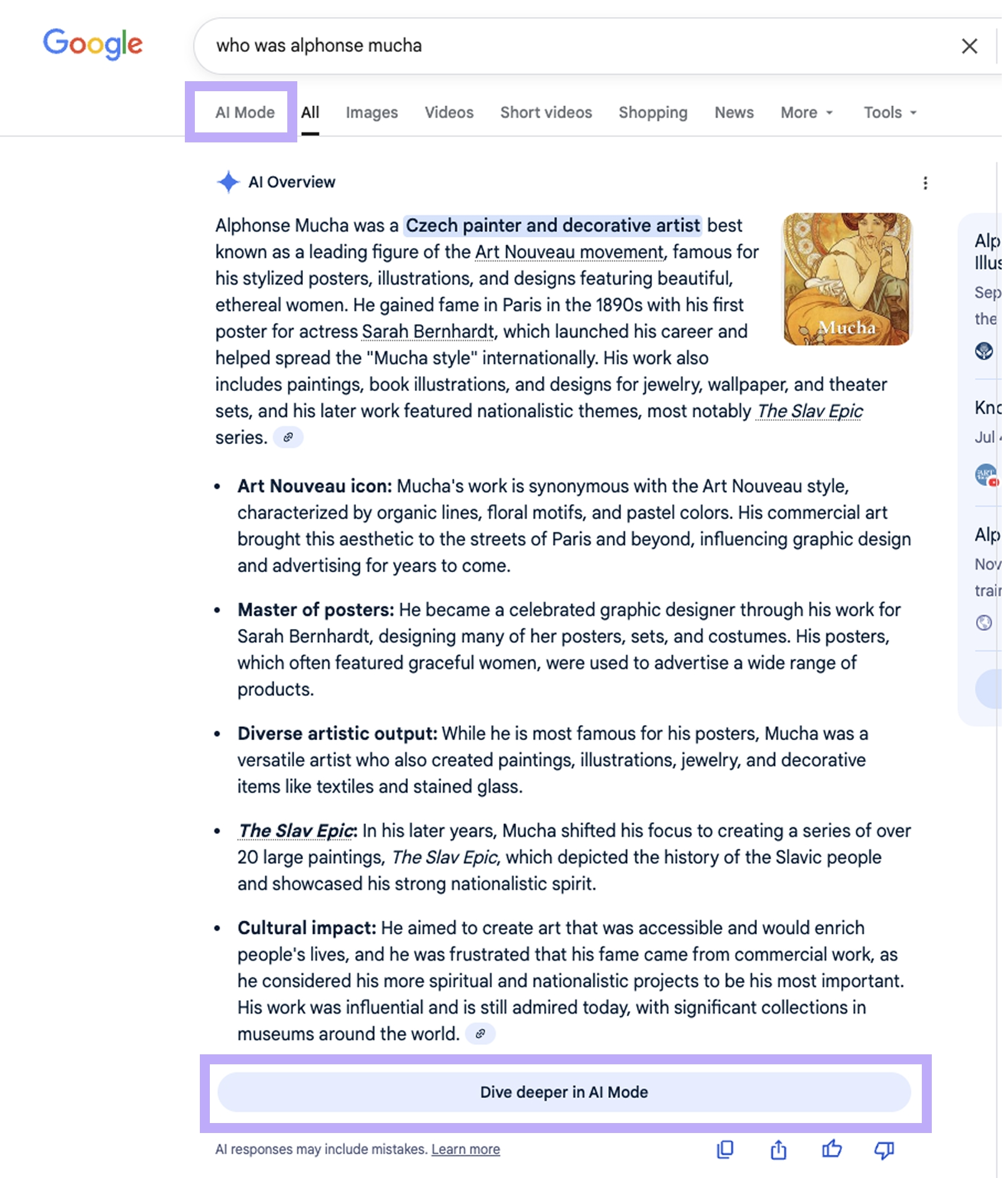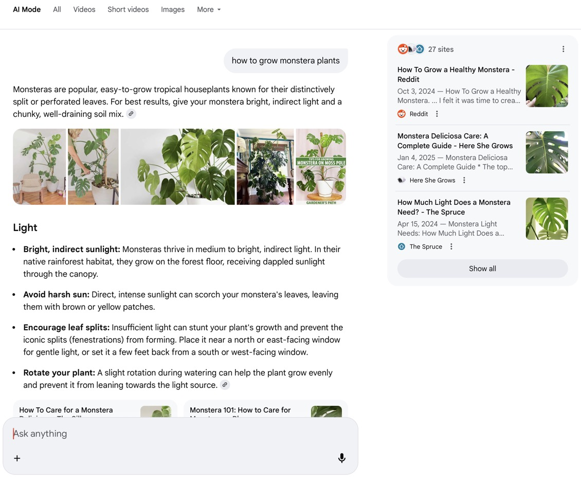 AI 模式有兩個入口:搜尋結果頁面的標籤,或者 AI 概述底部的按鈕。但要看到底部這個按鈕,使用者需要先展開 AI 概述,然後滾動到最底部(通常內容很長)。在我們的研究中,即使參與者展開了 AI 概述,也很少注意到這個按鈕。
