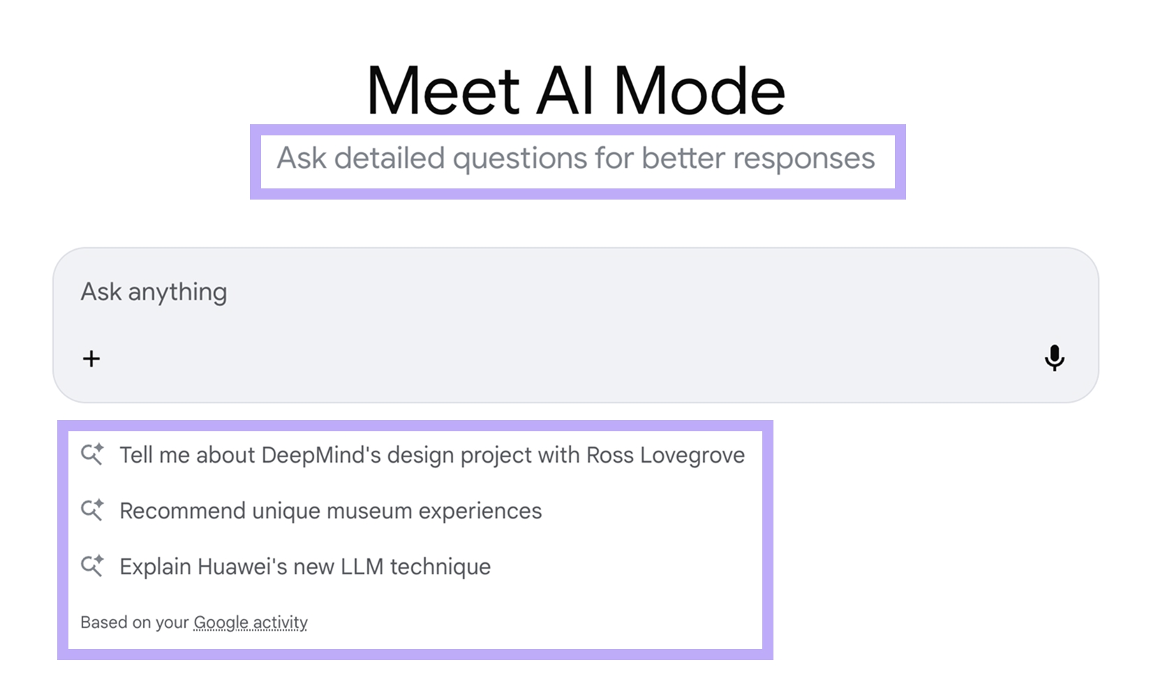 允許使用者基於初步回答繼續提問;提供可點選的後續問題建議,便於探索相關內容;顯著區別於 Gemini 等其他 Google AI 工具的文字輸入建議形式。
