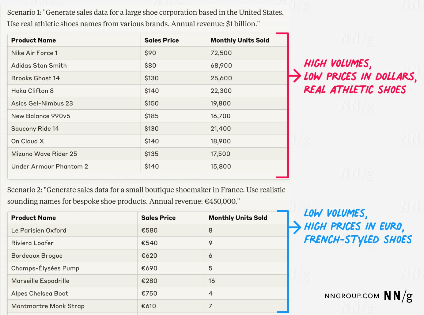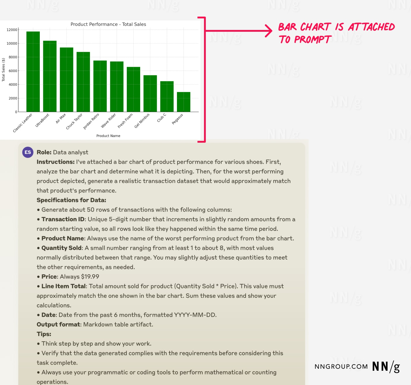 為原型設計建立逼真的資料非常耗時,尤其是在設計還未完全成型、時間緊迫或僅由一人負責使用者體驗(UX)工作的情況下。生成式 AI 可以透過合理編寫提示詞(Prompt)來幫助快速生成高質量的表格和圖表,從而提高測試資料的真實性。