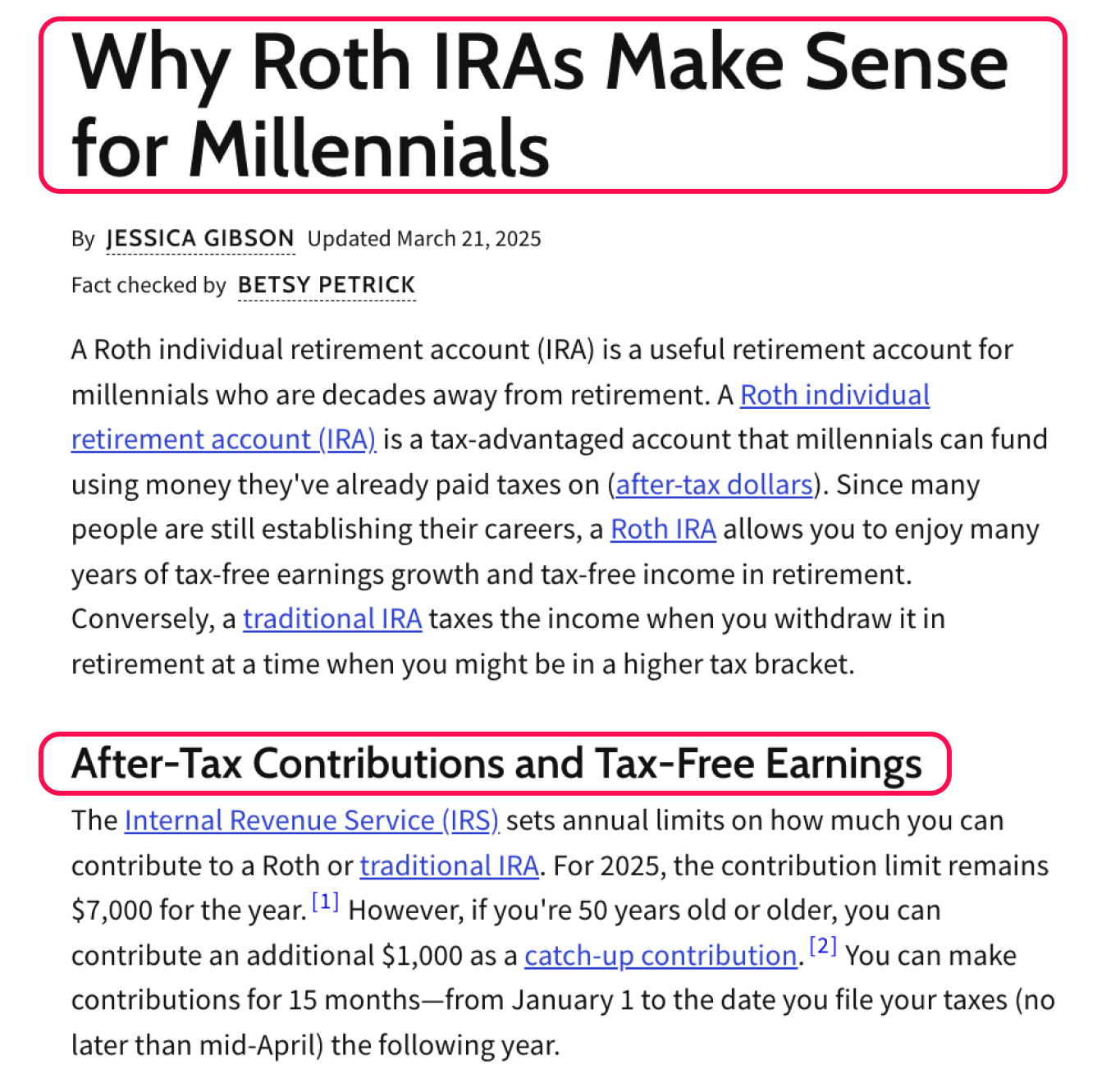 Investopedia 主標題直接告訴使用者Roth IRA(稅後個人退休賬戶)對年輕人有好處。副標題”稅後繳款與免稅收益”概括了文章要點之一,也是Roth IRA的主要優勢之一。它為使用者快速理解內容結構和重點提供幫助。
