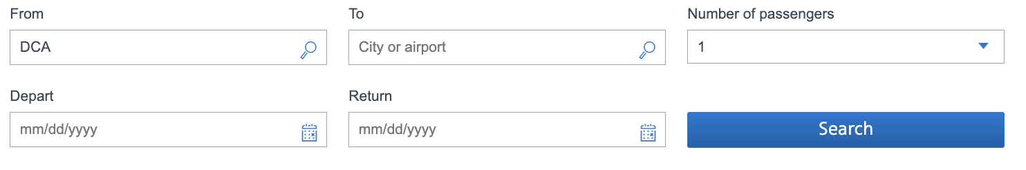 American Airlines 佔位文字:“城市或機場”、“mm/dd/yyyy”提示輸入格式或要求。降低使用者輸入錯誤率,提升填寫效率