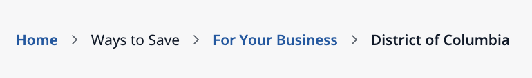 Pepco 的麵包屑路徑“首頁 > 節省方式 > 企業使用者 > 哥倫比亞特區”顯示當前頁面在網站結構中的位置。幫助使用者返回上級頁面,減少迷路感