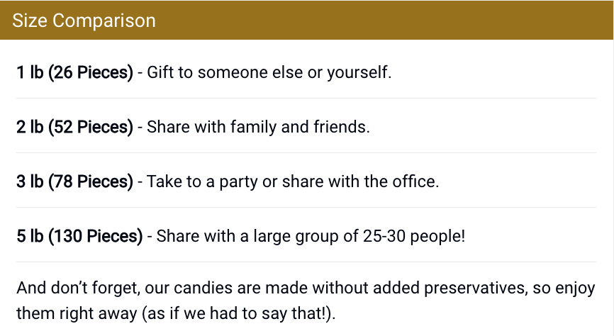 See’s Candies的糖果盒尺寸表格:雖包含促銷語言(無防腐劑),但主要目標是傳遞資訊(為不同規模聚會選擇合適包裝)