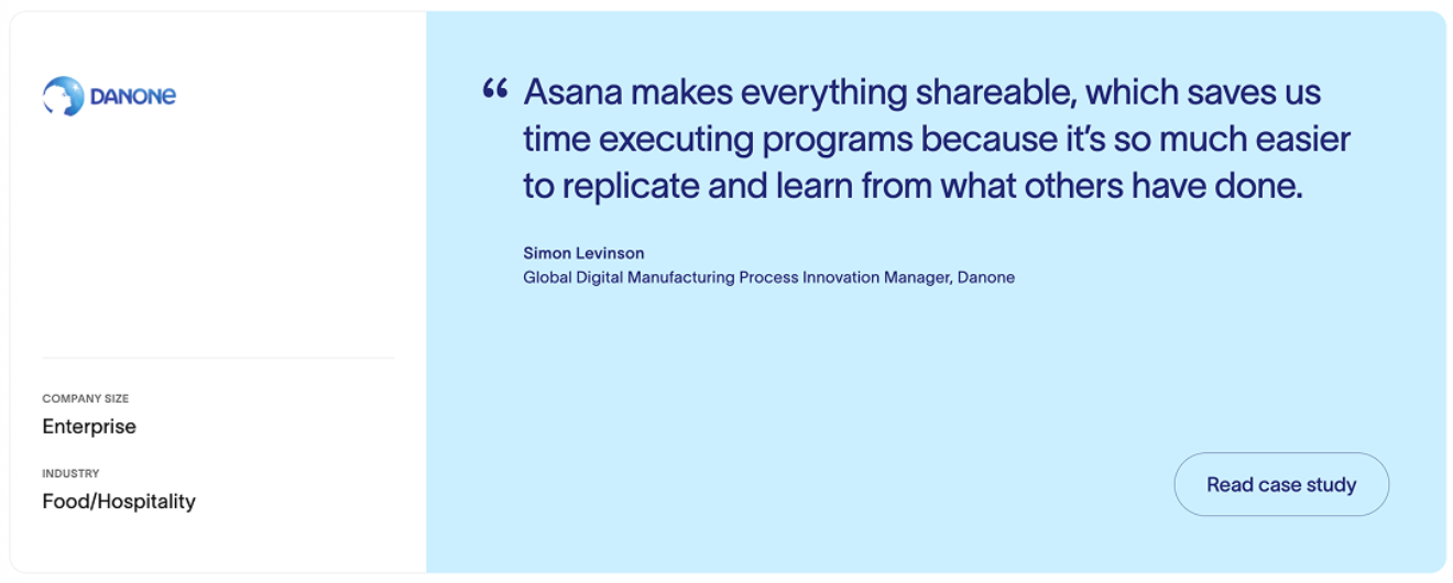 Asana卡片:一段來自 Danone 高管的使用者評價(testimonial),強調使用 Asana 能提高效率、分享資源、便於學習他人經驗。透過使用者好評提升品牌可信度;鼓勵潛在客戶點選“Read case study”瞭解更多;目的是吸引使用者採取某種行動(如使用 Asana)→ 促進轉化。