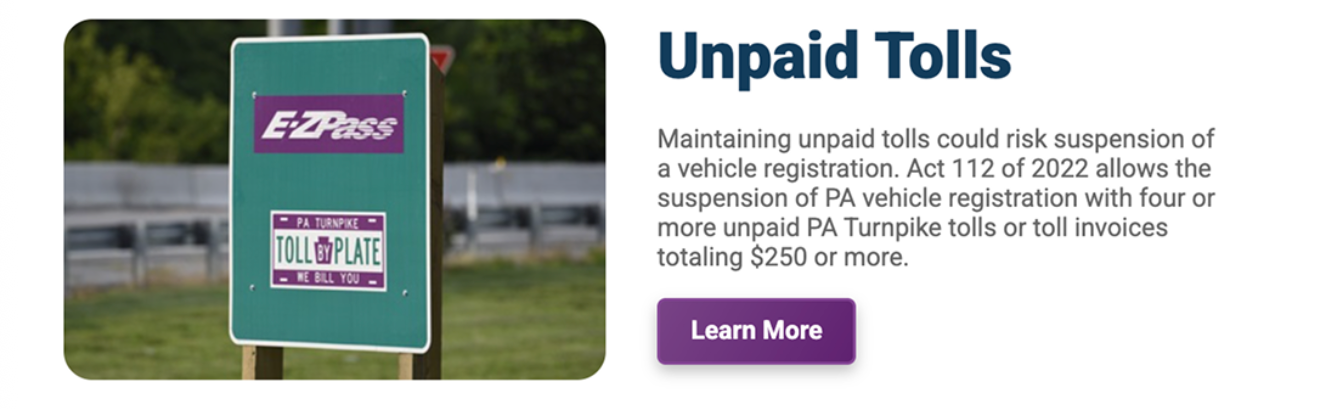 PA Turnpike 未繳費提醒:詳細解釋了一項關於“未繳高速費可能導致車輛註冊暫停”的法律規定。提供法規解釋和實際後果;幫助使用者瞭解問題、做出決策;主要作用是傳達關鍵資訊,不是為了促銷或轉化。